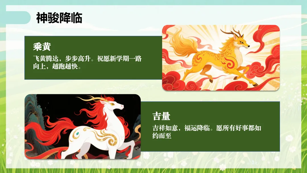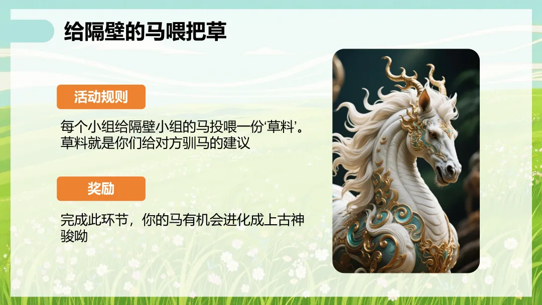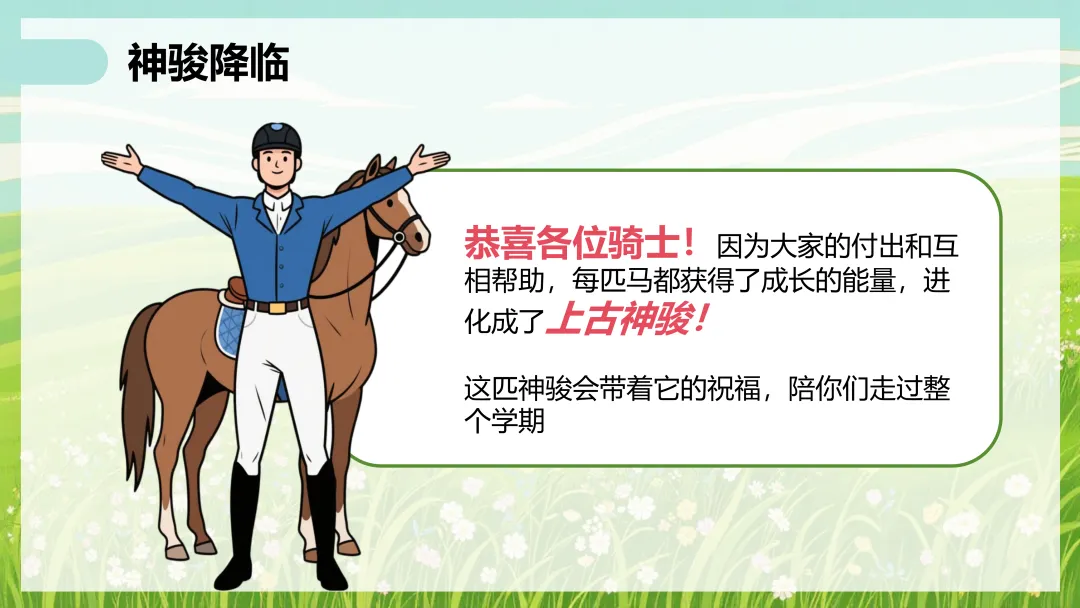 设计目的:用神骏抽卡营造仪式感,给新学期积极的心理暗示;让每个小组带着专属祝福结束课程,留下温暖收尾