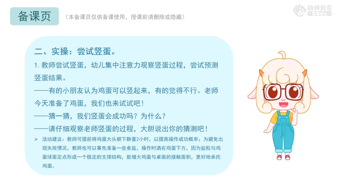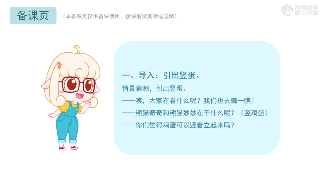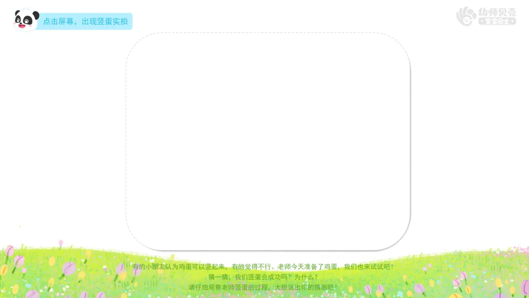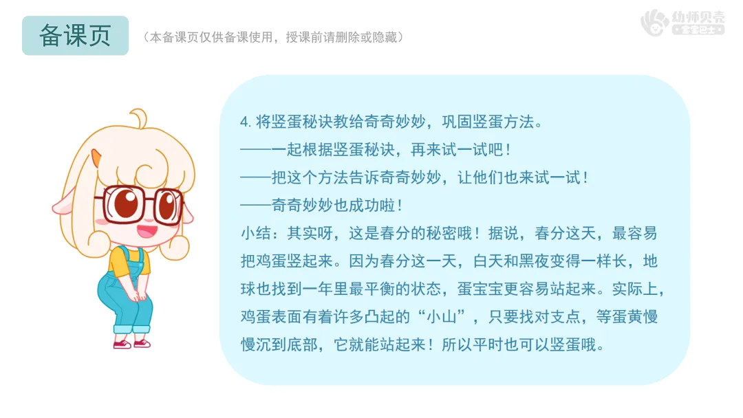 l重点:保持注意力观察“竖蛋”过程,能用简单的语言或动作复述“竖蛋秘诀”,通过游戏感受春分习俗的趣味性。