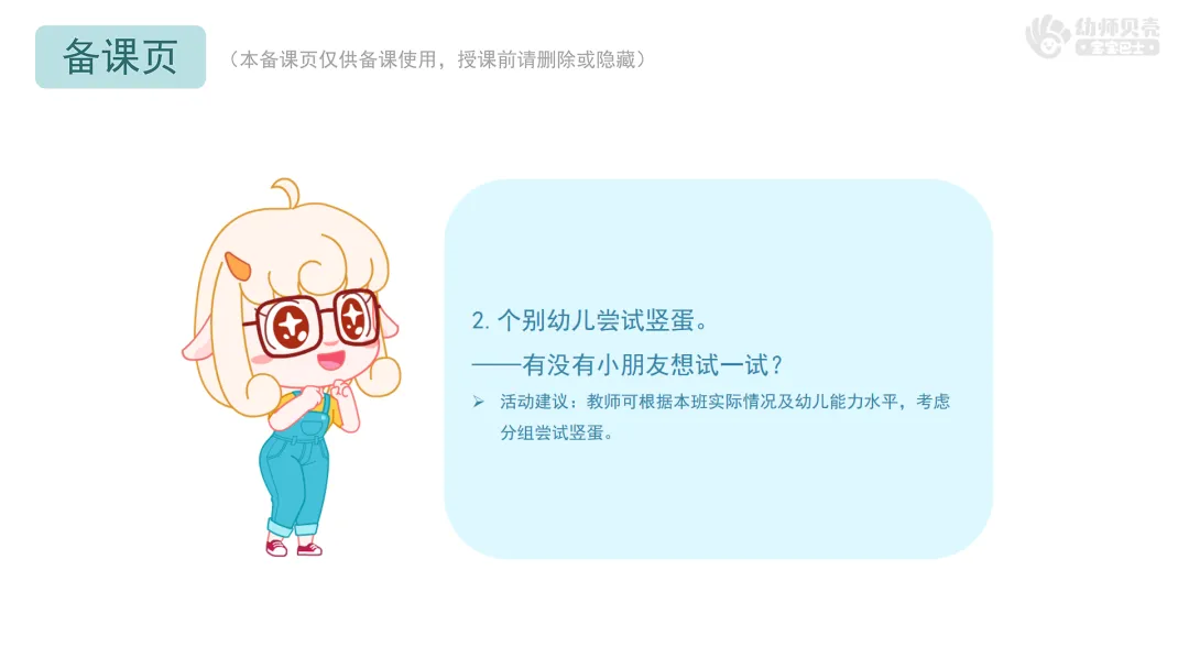 Ø活动建议:教师可根据本班实际情况及幼儿能力水平,考虑分组尝试竖蛋。