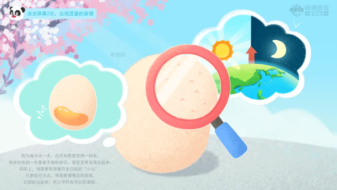 小结:其实呀,这是春分的秘密哦!据说,春分这天,最容易把鸡蛋竖起来。因为春分这一天,白天和黑夜变得一样长,地球也找到一年里最平衡的状态,蛋宝宝更容易站起来。实际上,鸡蛋表面有着许多凸起的“小山”,只要找对支点,等蛋黄慢慢沉到底部,它就能站起来!所以平时也可以竖蛋哦。