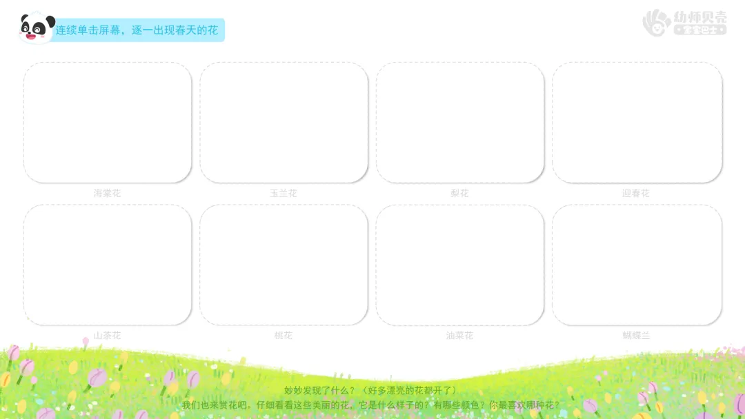 ——妙妙发现了什么?(好多漂亮的花都开了) ——我们也来赏花吧。仔细看看这些美丽的花,它是什么样子的?有哪些颜色?