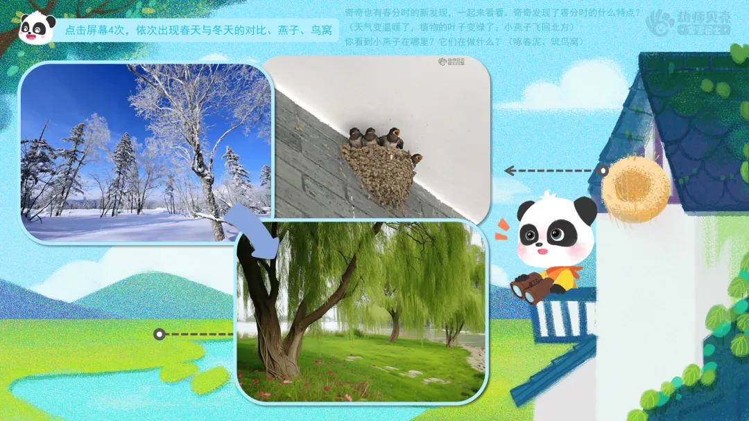 ——奇奇发现了春分时的什么特点?(天气变温暖了,植物的叶子变绿了;小燕子飞回北方)