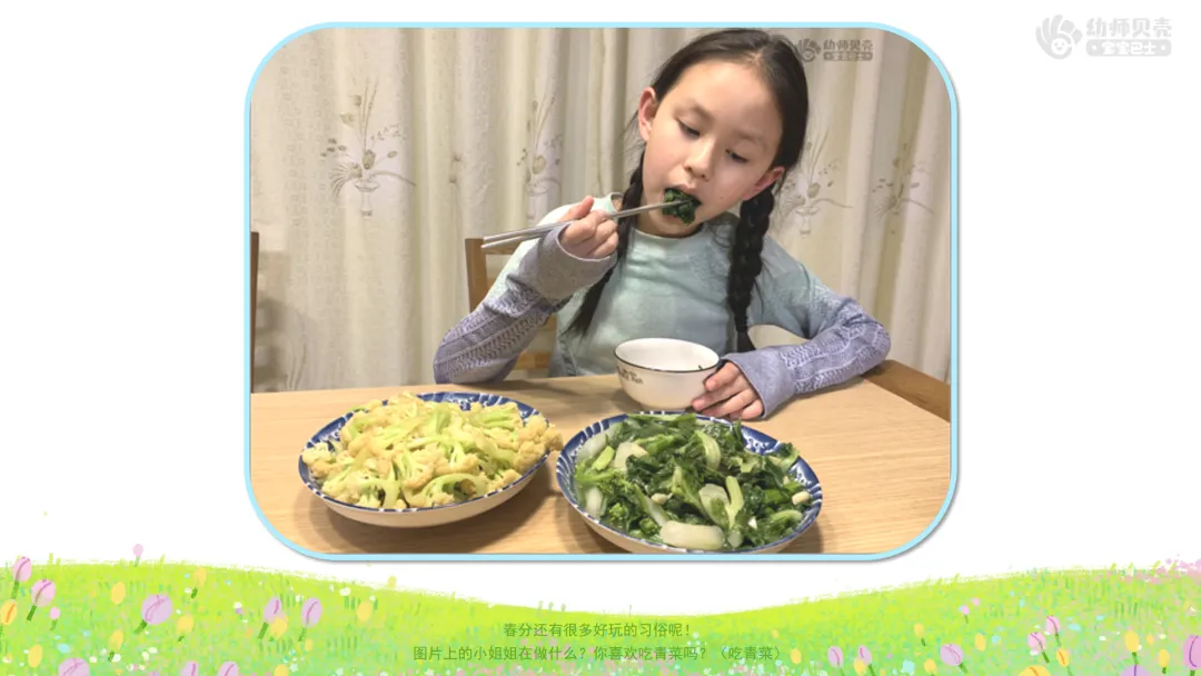 ——图片上的小姐姐在做什么?你喜欢吃青菜吗?(吃青菜)