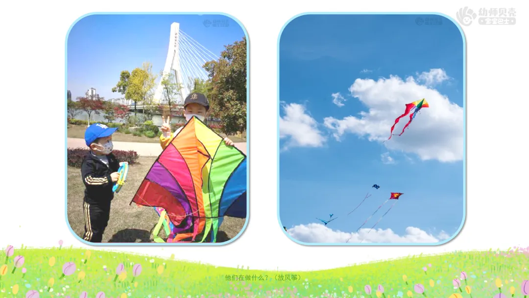 鼓励家长在周末带领幼儿外出踏青,记录幼儿放风筝、找花朵的趣味时刻,感受春天的生机。