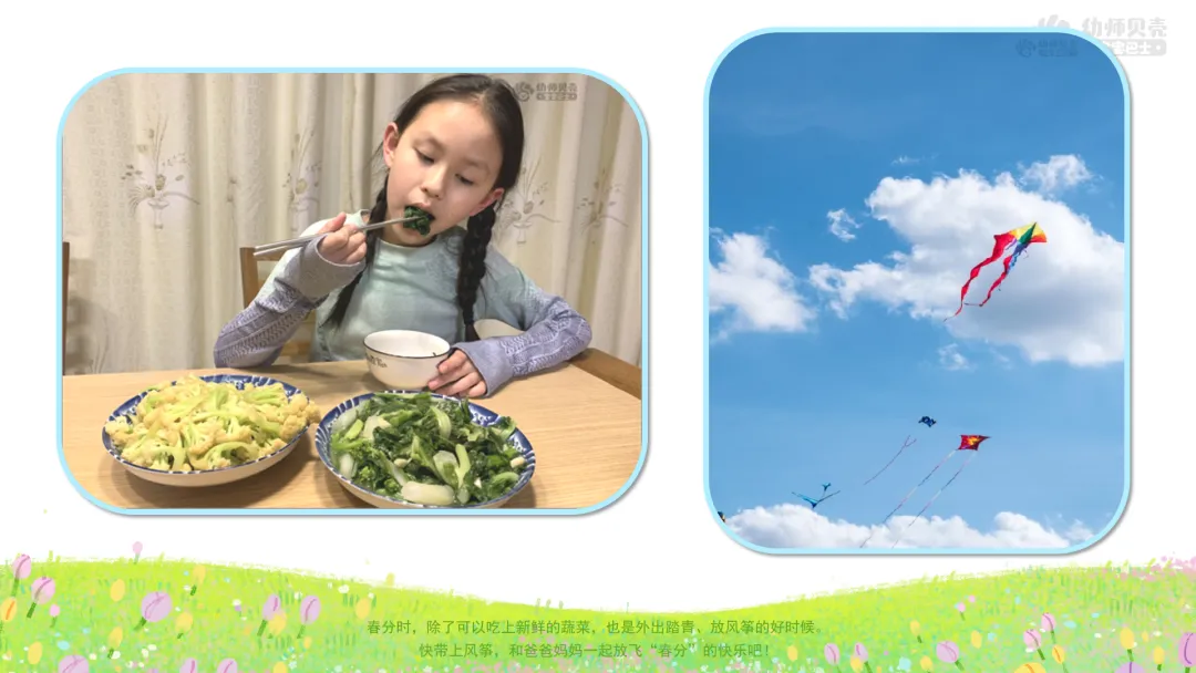 小结:春分时,除了可以吃上新鲜的蔬菜,也是外出踏青、放风筝的好时候。快带上风筝,和爸爸妈妈一起放飞“春分”的快乐吧!