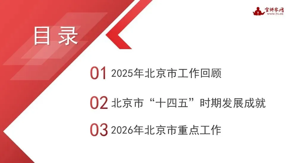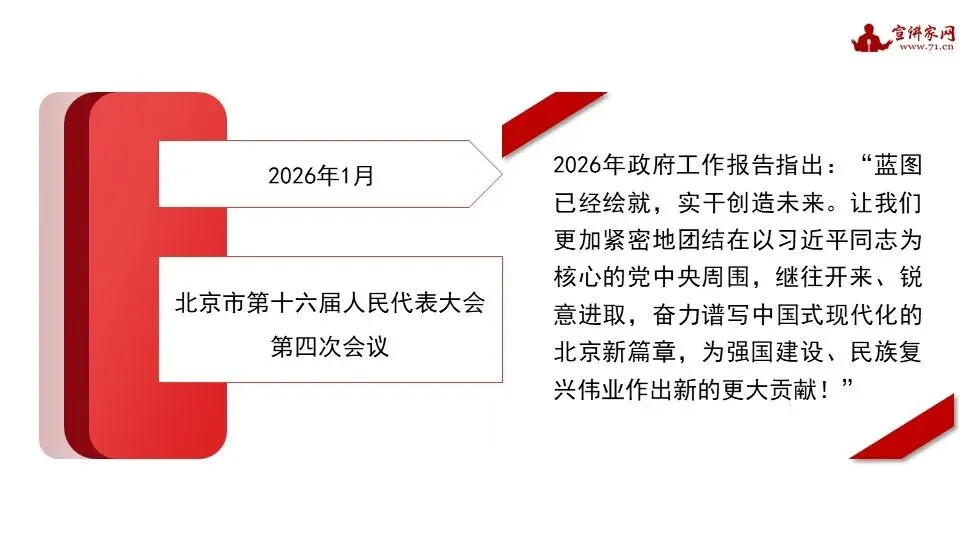 2026年1月,北京市第十六届人民代表大会第四次会议和中国人民政治协商会议北京市第十四届委员会第四次会议胜利召开。2026年是“十五五”开局之年,要以新时代首都发展为统领,深入实施京津冀协同发展战略,奋力谱写中国式现代化的北京新篇章。本期课件围绕首都建设,回顾了2025年的工作成果,梳理了“十四五”时期的发展成就,并着重讲述了2026年的重点工作。