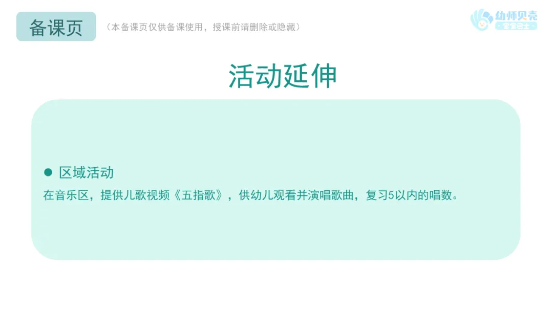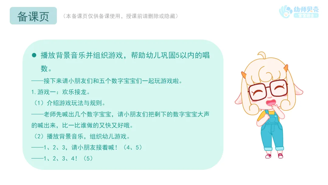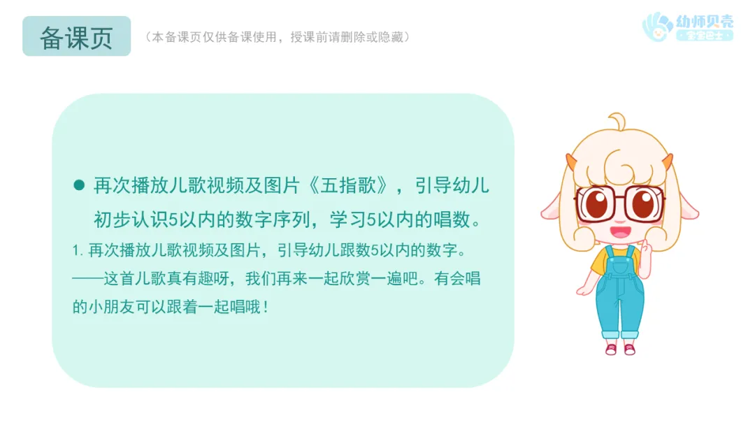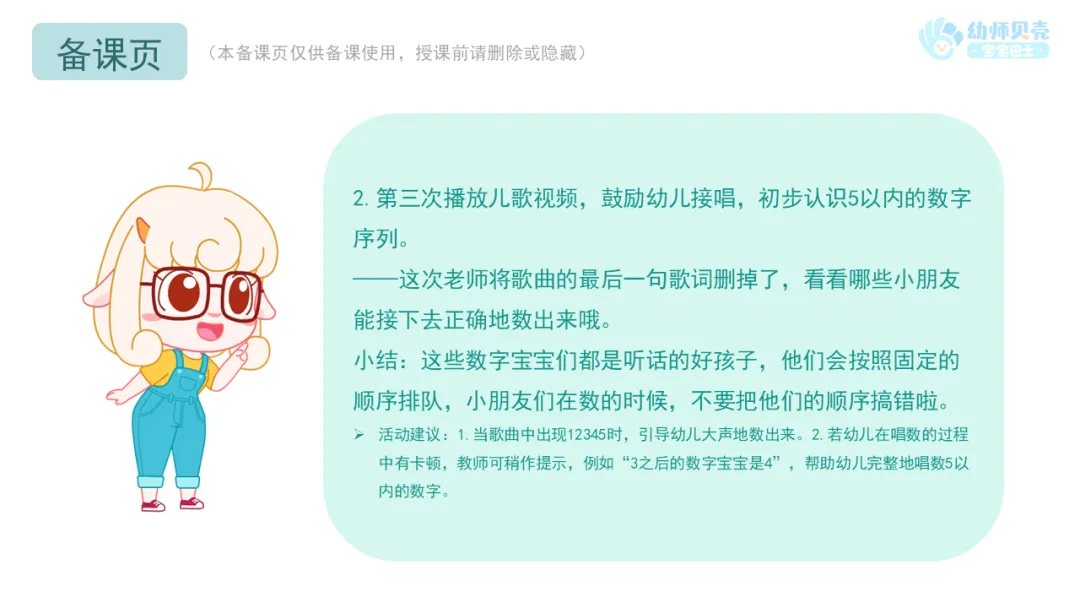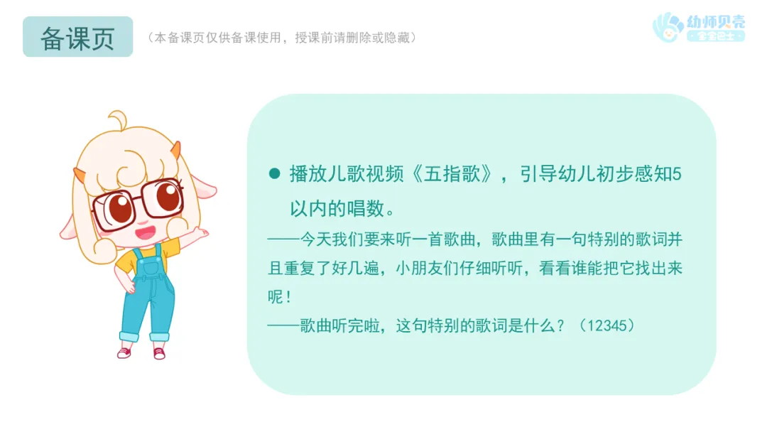 Ø活动建议:1.当歌曲中出现12345时,引导幼儿大声地数出来。2.若幼儿在唱数的过程中有卡顿,教师可稍作提示,例如