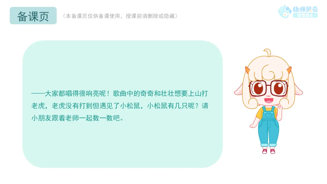 ——大家都唱得很响亮呢!歌曲中的奇奇和壮壮想要上山打老虎,老虎没有打到但遇见了小松鼠,小松鼠有几只呢?请小朋友跟着老师一起数一数吧。