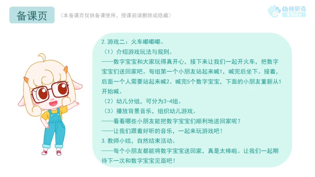 ——数字宝宝和大家玩得真开心,接下来让我们一起开火车,把数字宝宝们送回家吧。每组第一个小朋友站起来喊1,喊完后坐下。接着,后面一个人需要站起来喊2。喊完5个数字宝宝,下面的小朋友重新从1开始喊。