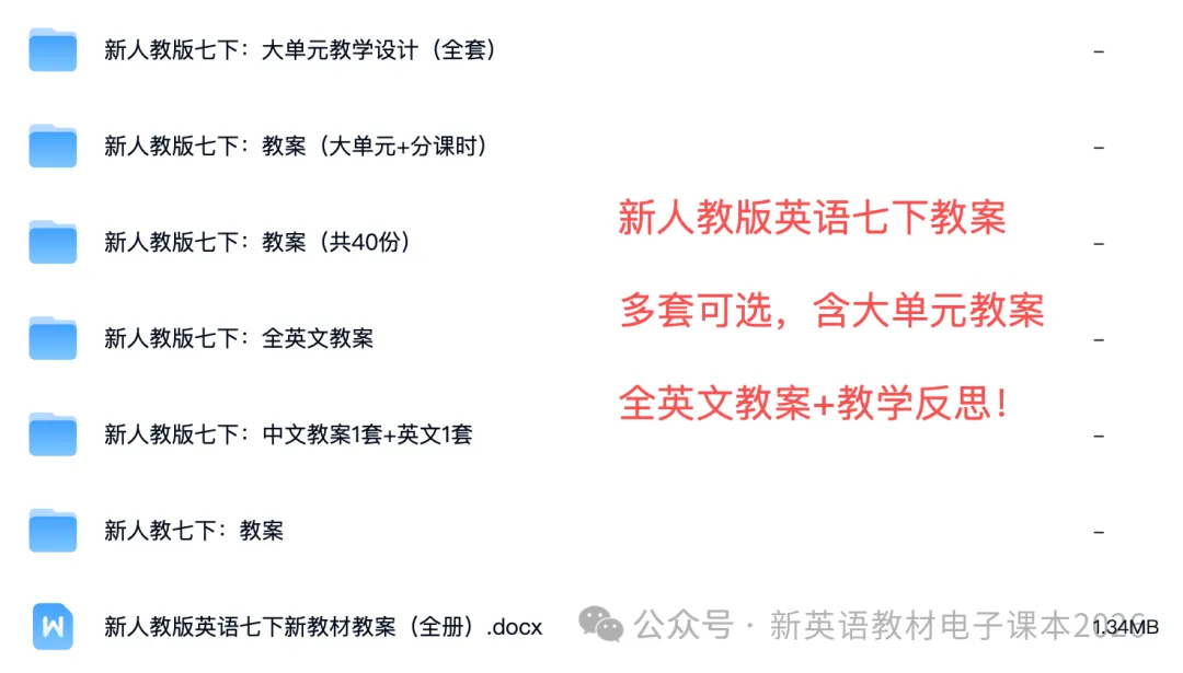 2026重新整理新人教版七下英语教案全册Unit1-Unit8(含英语教案+大单元教学设计+教学反思丨共7套),分类归纳人教版英语七下资料包(含课件+教学设计+分层练习+单元检测+期中复习+期末复习+语法精炼+话题写作+阅读积累+单词课文跟读音频MP3)。文末获取下载方式!