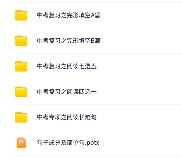 大年初八很多人都开始上班啦!我这也快开学了!今天抽空整理了2025年初三总复习时我制作的几个专题复习课件!这套课件主要是依据江西中考题型来制作的,包含完形填空A篇(选择类)和B篇(选词填空);阅读理解四选一题型;阅读理解七选五题型,长难句分析和五大基本句型,总共六个课件!内容如下图: