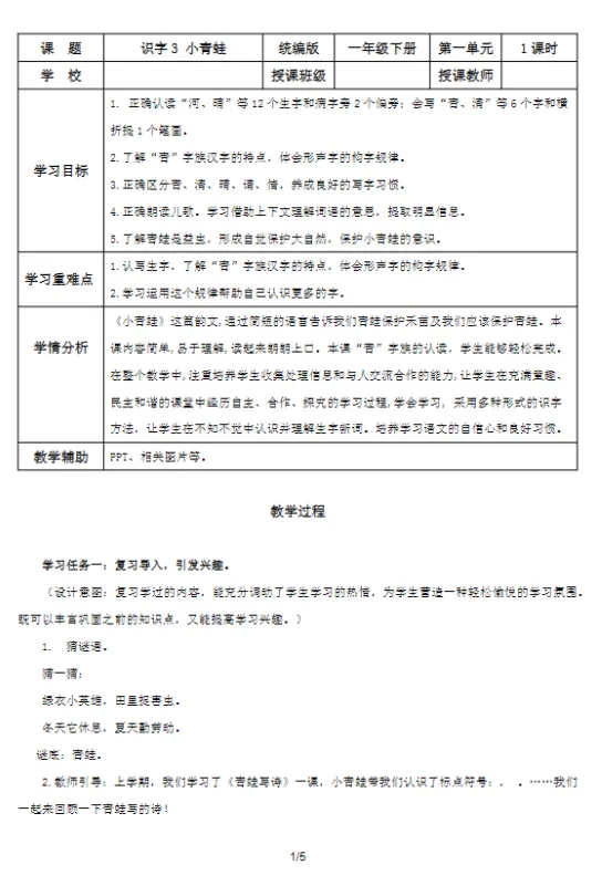 【精品课件】一年级下《小青蛙》课件+教学设计+分层作业+学习任务单