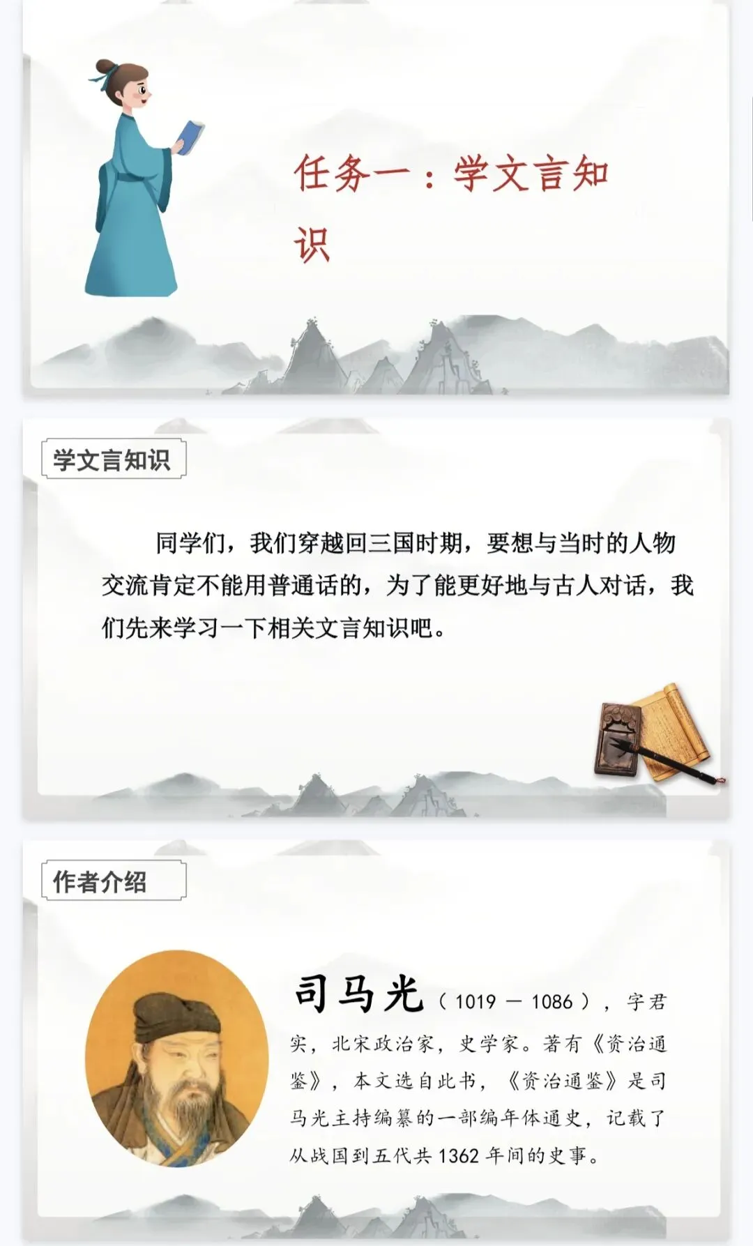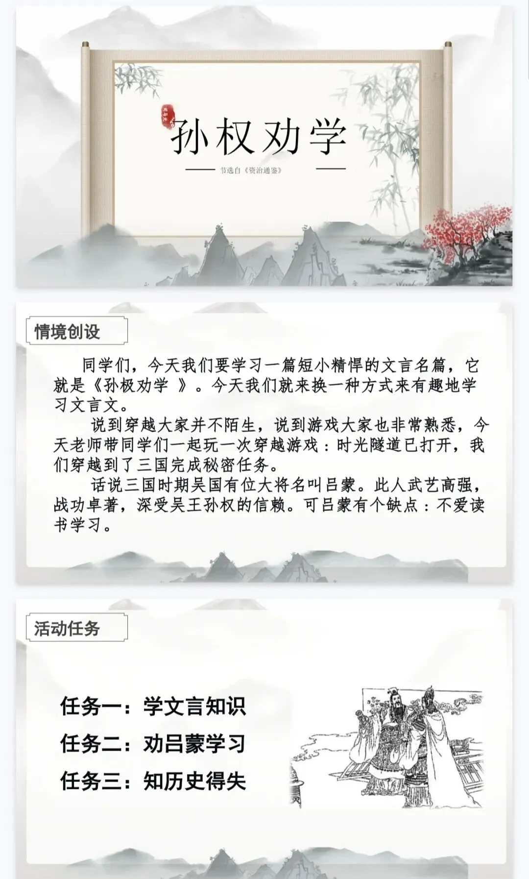 - 情境驱动:以“穿越三国,劝吕蒙学习”为核心任务,串联三大学习环节,让学生化身历史参与者。