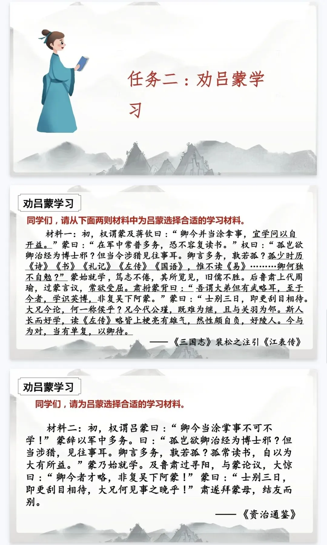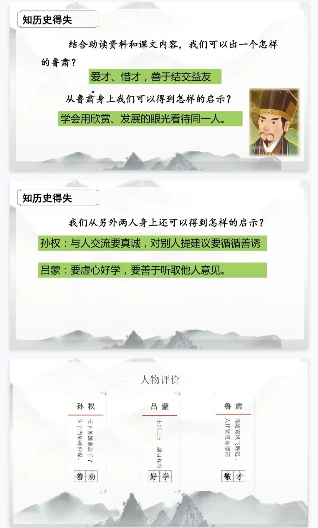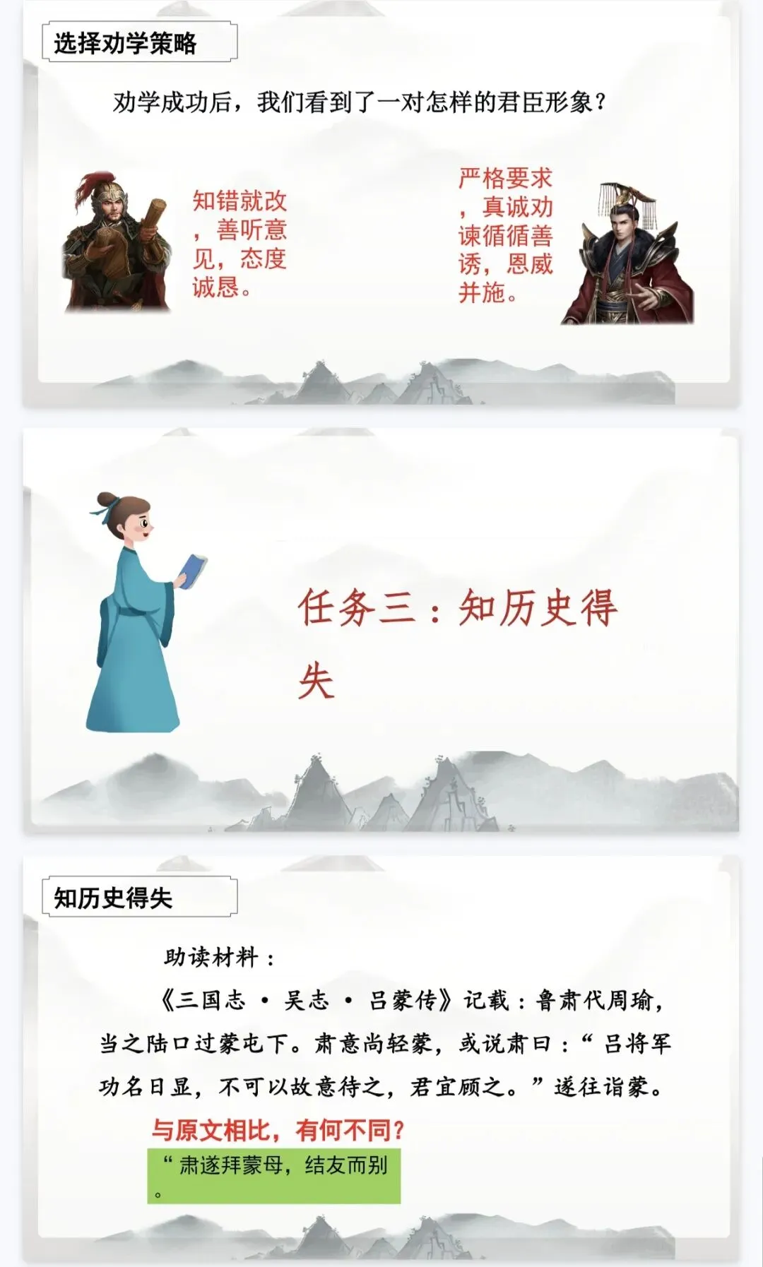 - 历史延伸:结合《三国志》史料,从吕蒙、鲁肃的故事中提炼成长启示,实现“以史鉴今”。