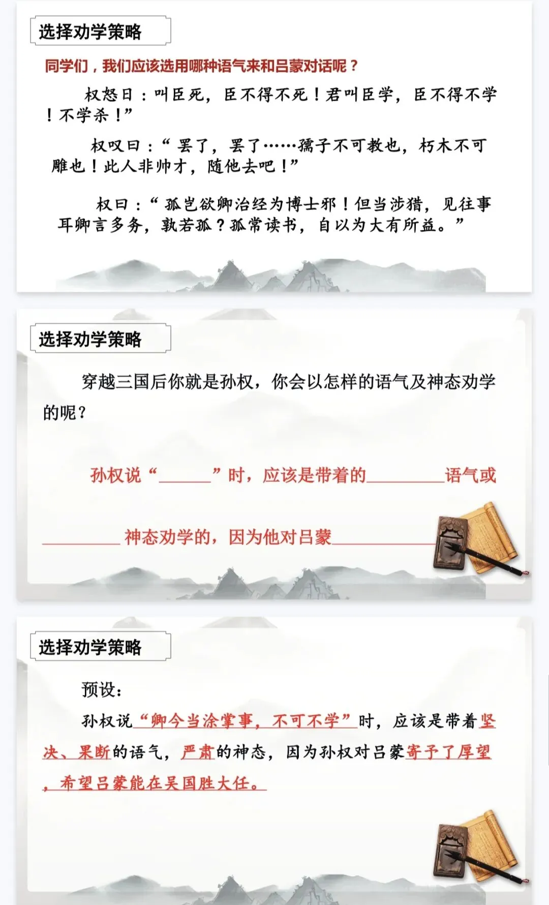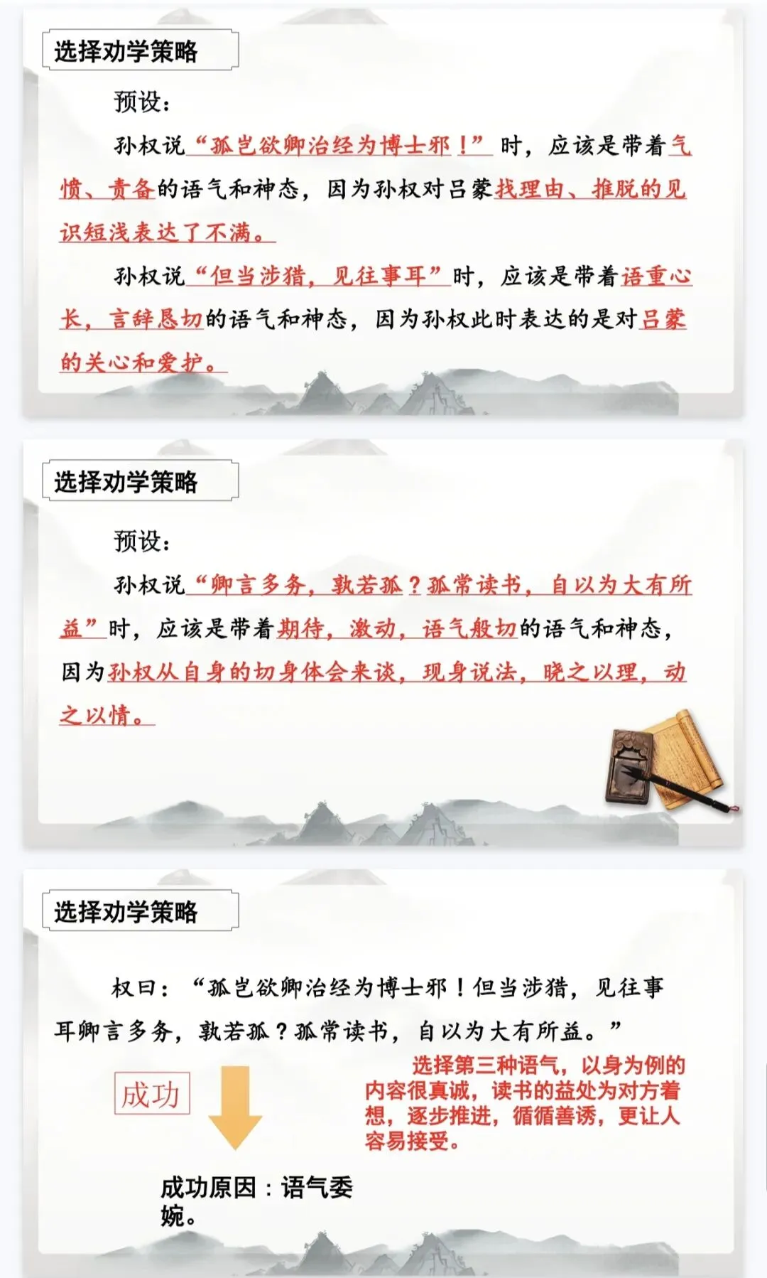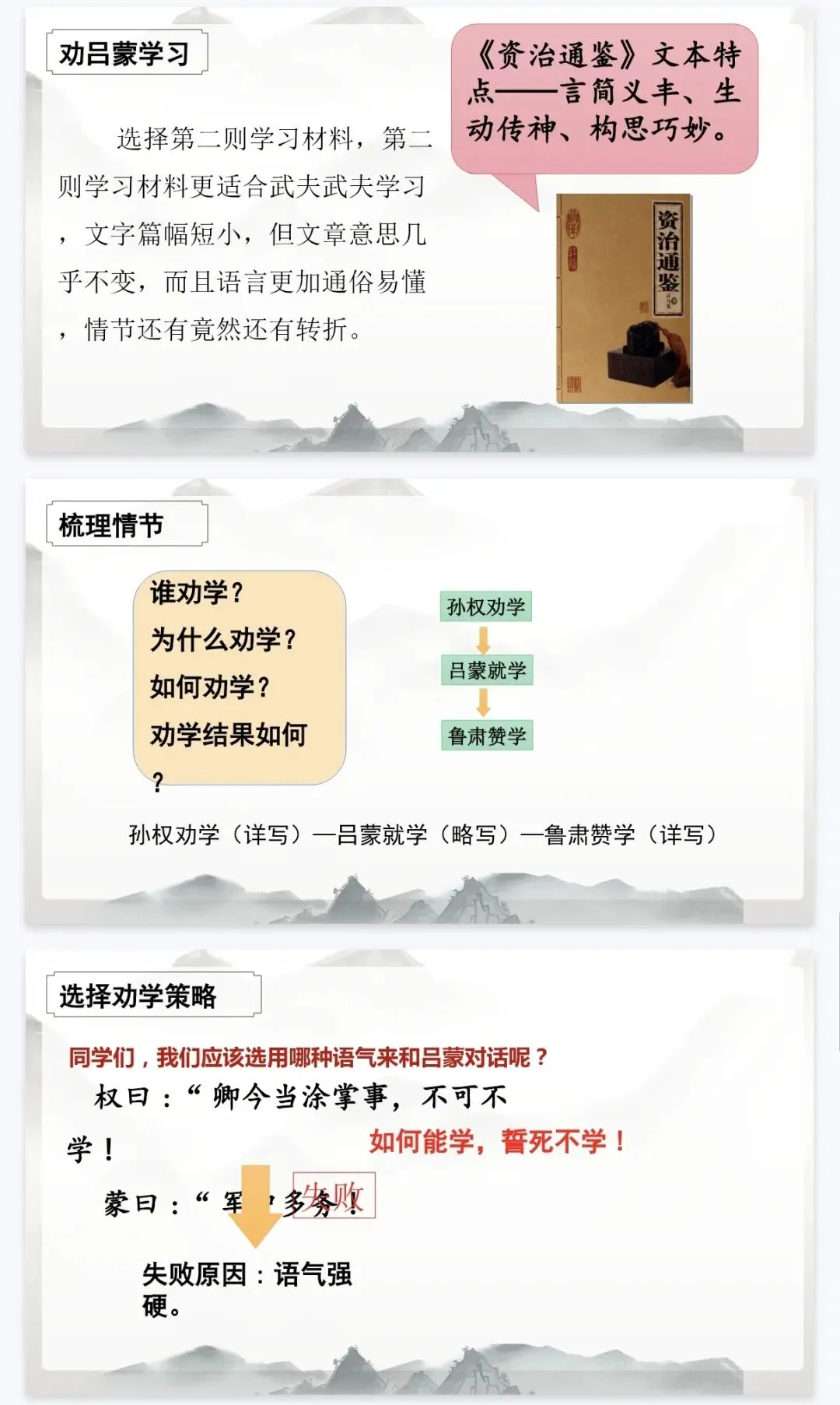 - 策略探究:对比不同劝学语气,分析孙权“循循善诱”的沟通智慧,让学生读懂人物,学会表达。