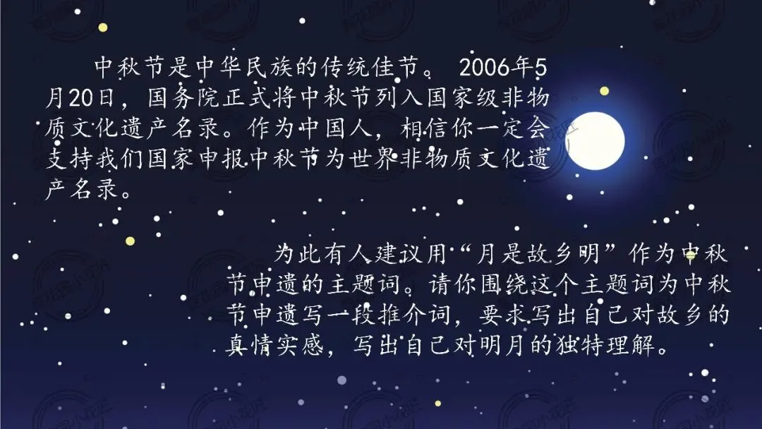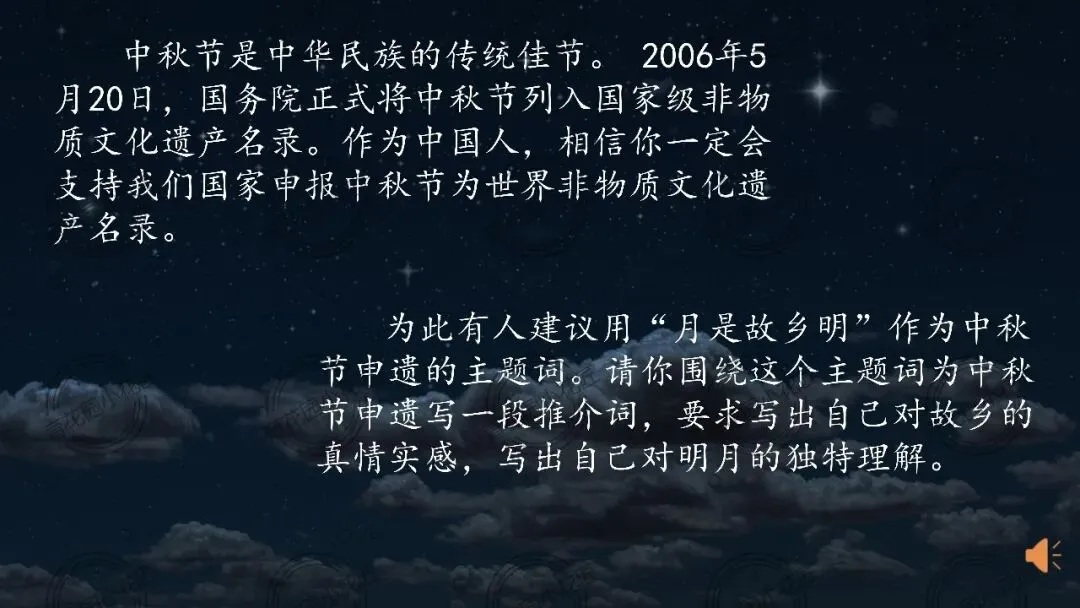 课堂以中秋节申遗写推介词为任务驱动,让学生在品读、共情、创作中实现语文能力与文化认同的双重进阶,工具性与人文性完美统一。整节课诗意盎然、层层递进,既有可复制的教学路径,又有直抵人心的文化浸润,值得每一位语文老师细细品读、借鉴学习。