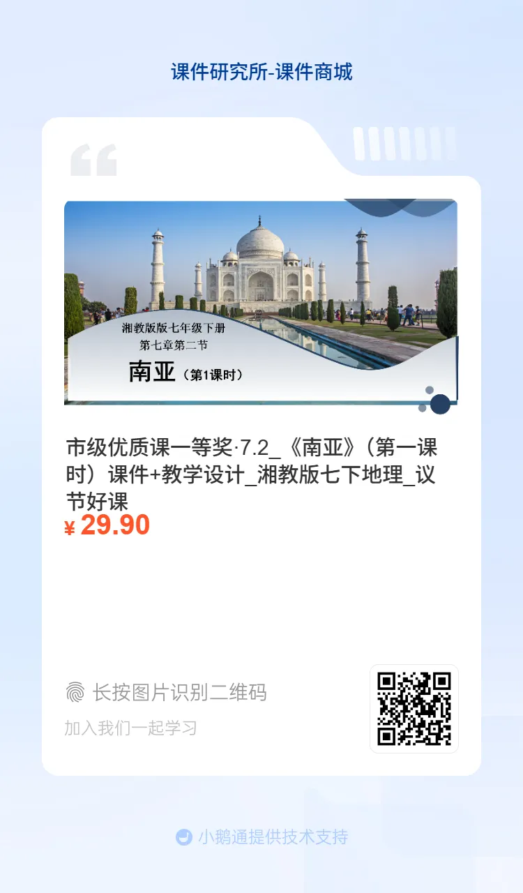 今天要分享的是一个市级优质课一等奖课件《南亚》(第一课时)。本课件以《西游记》天竺取经为导入,贴合学情吸引学生兴趣。设计紧扣地理位置、地形河流、气候农业三大核心,通过小组合作、读图分析等活动,层层探究南亚自然地理特征,重点突破三大地形区、两大河流及热带季风气候对农业的影响。以问题链引导学生梳理地理要素联系,搭配达标检测巩固知识,注重培养学生读图和综合分析能力。