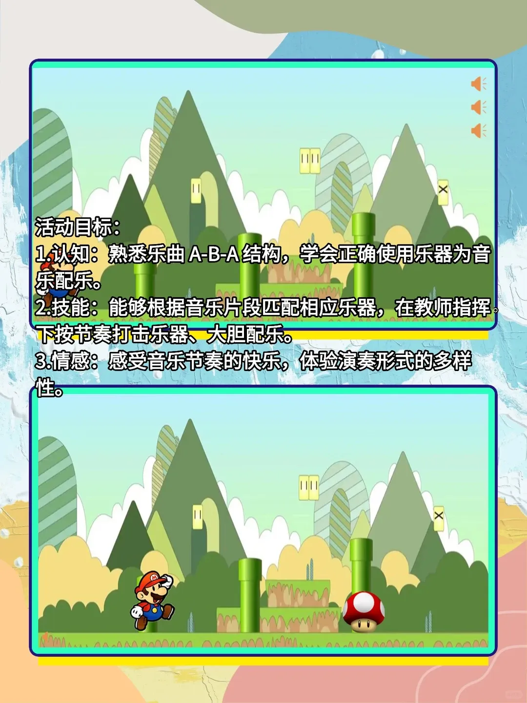 1.认知:熟悉乐曲A-B-A结构,学会正确使用乐器为音乐配乐。