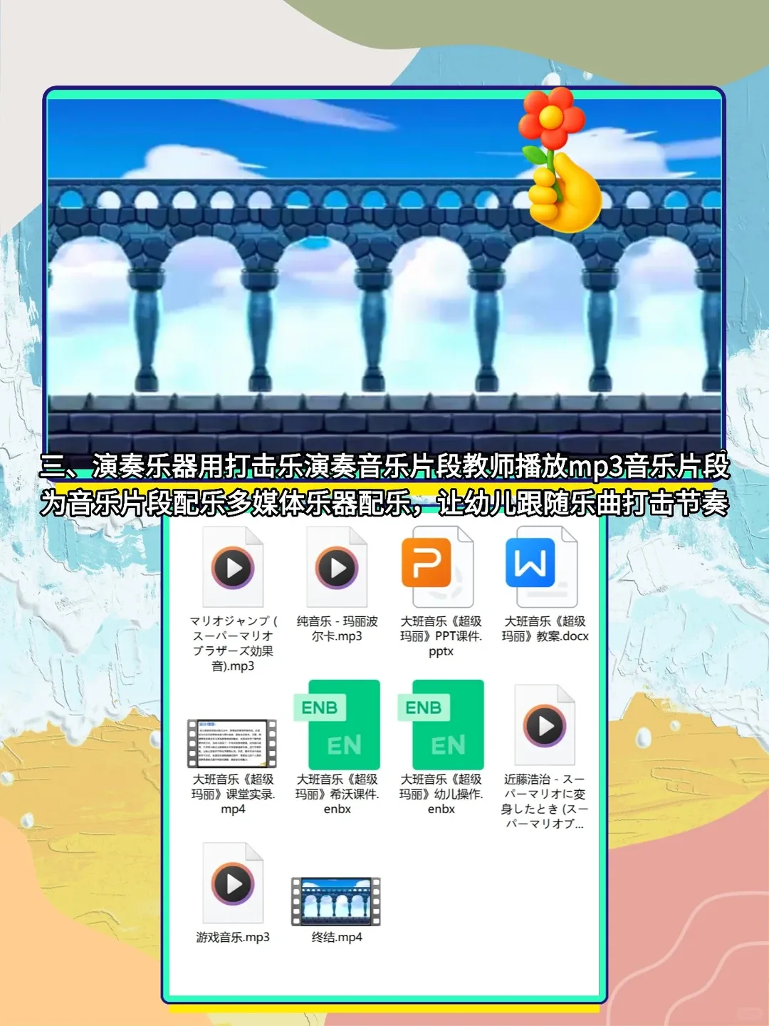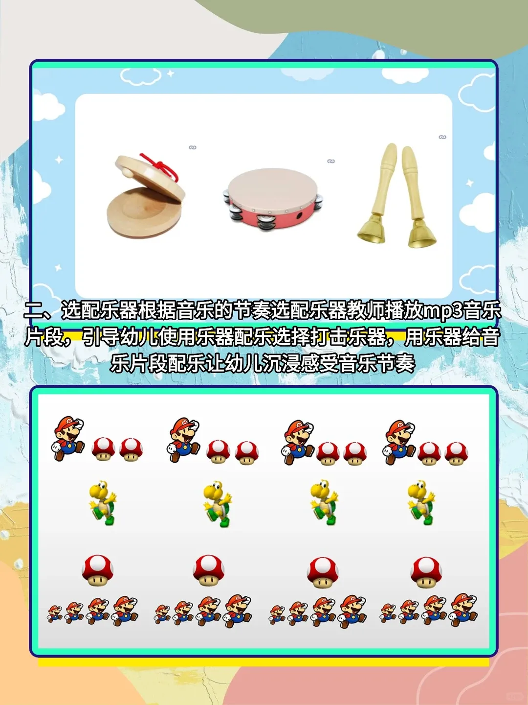 2.技能:能够根据音乐片段匹配相应乐器,在教师指挥下按节奏打击乐器、大胆配乐。