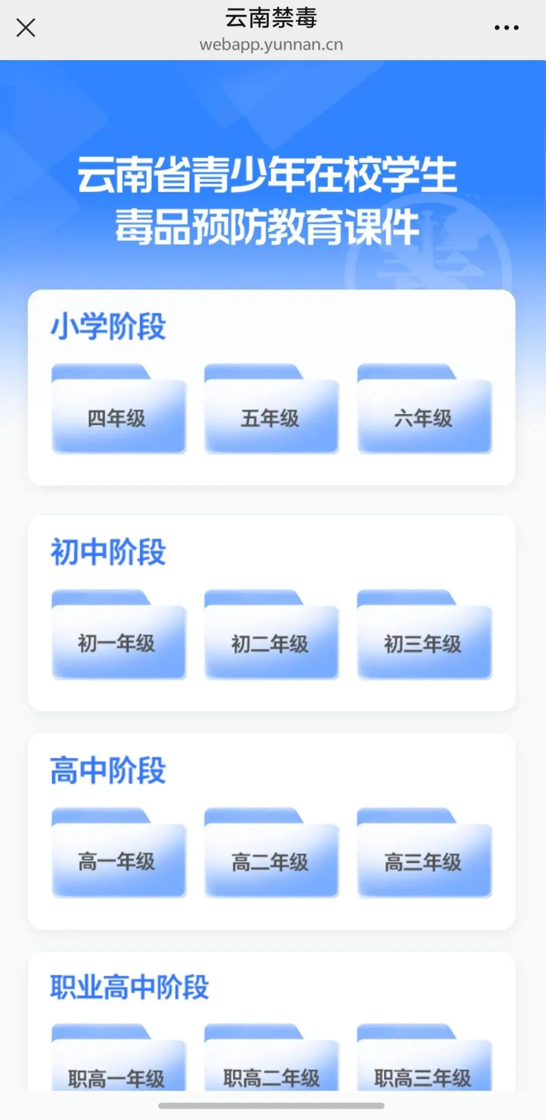 3、进入“云南省青少年在校学生毒品预防教育课件”页面,点击对应学段即可下载。