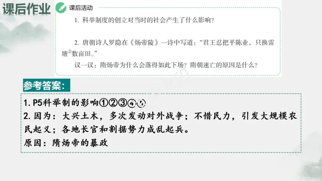 诸君安好!2026春七下共21课,课件正在更新中,上课自用,开学无忧,贴近学情、让课堂更高效,让历史备课更轻松,让历史学习更愉悦!添加文末小编微信……课件名称 | 【2026春教材】七下历史第1课《隋朝的统一与灭亡》课件作者 | 初中历史园地公众号小编【格桑花】