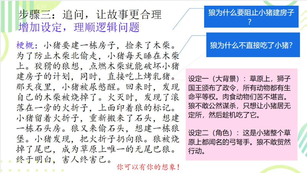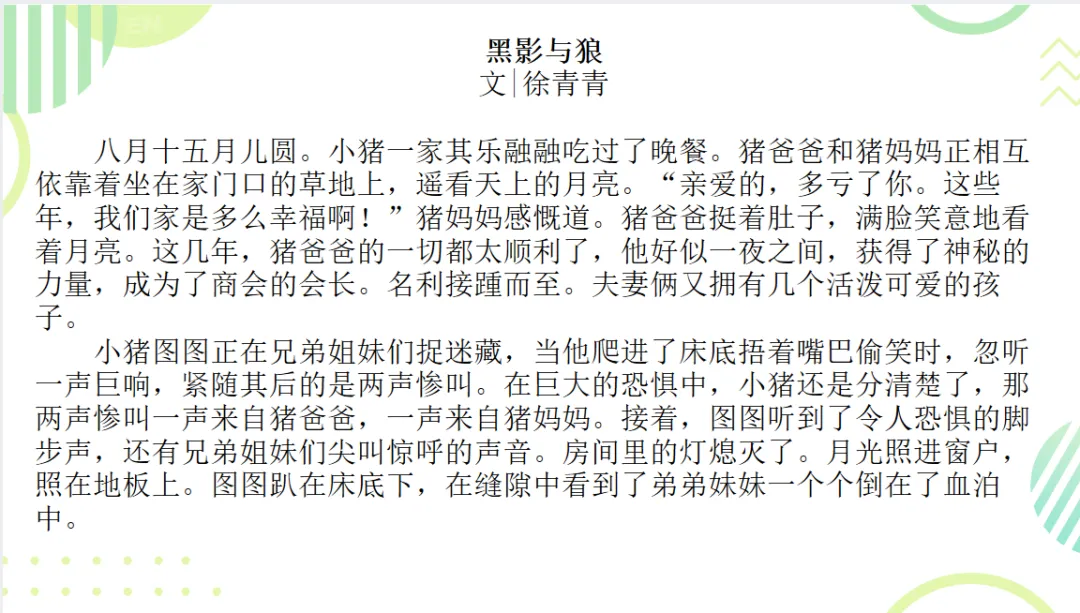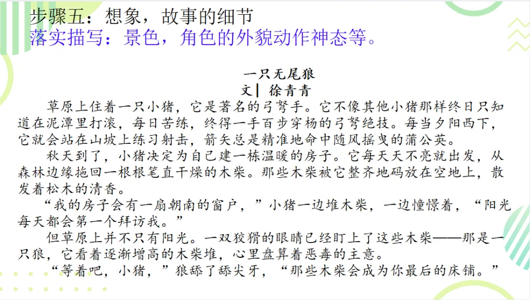 七年级上册第六单元写作任务为“发挥联想与想象”,这个单元有《小圣施威降大圣》《皇帝的新装》等故事,我就想教学生写故事。为此,我在上班路上听完了两本书,并把这套书买了回来。有图为证:我备了一堂课,写了两版故事。第一版故事一千余字,学生听完开始鼓掌,以为课堂迎来了高潮和结局。然后,我说,你们以为课堂结束了吗?没有!徐老师教作文就是要教得透透的。让我们给反派人物一个理由,再次升级这个故事!接着读了第二版(三千余字)故事,在正反派对决的时候,全班屏息凝神。读完,全班再次鼓掌。那一次,学生作文写得很好,展现了澎湃的写作热情。绝大部分字数一千起,部分三千加。我还在视频号发了一个小视频。现在我把这节课分享出来。马上开学了,老师们可以上着玩儿,孩子们可以写着玩儿。一只无尾狼