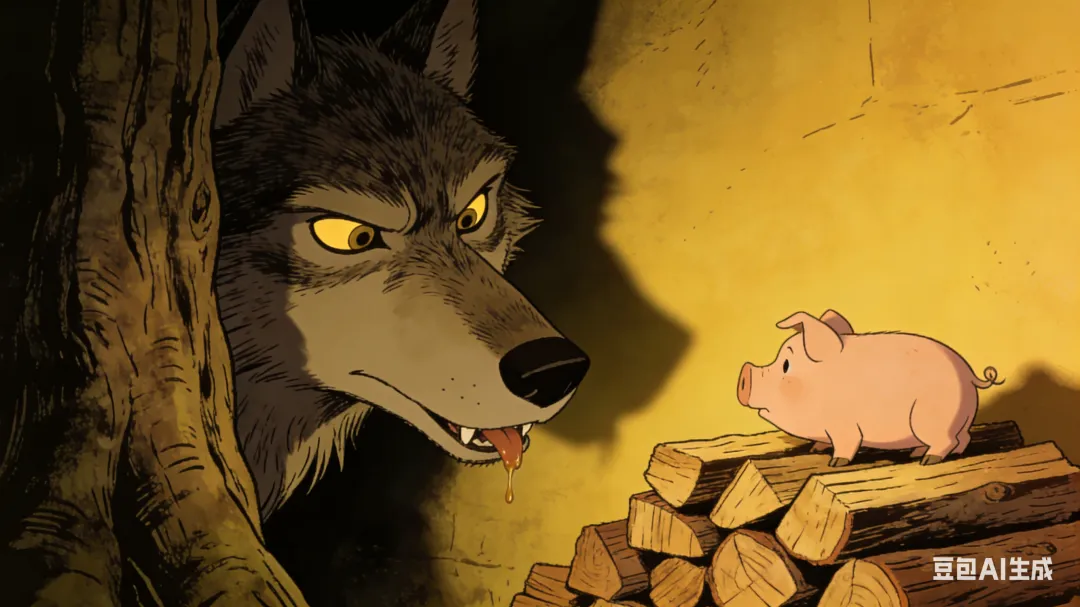 小猪沉浸在自己的幻想中,浑然不觉,有一双狡猾的眼睛已经盯上了它——那是一只狼,它看着逐渐增高的木柴堆,心里盘算着恶毒的主意。