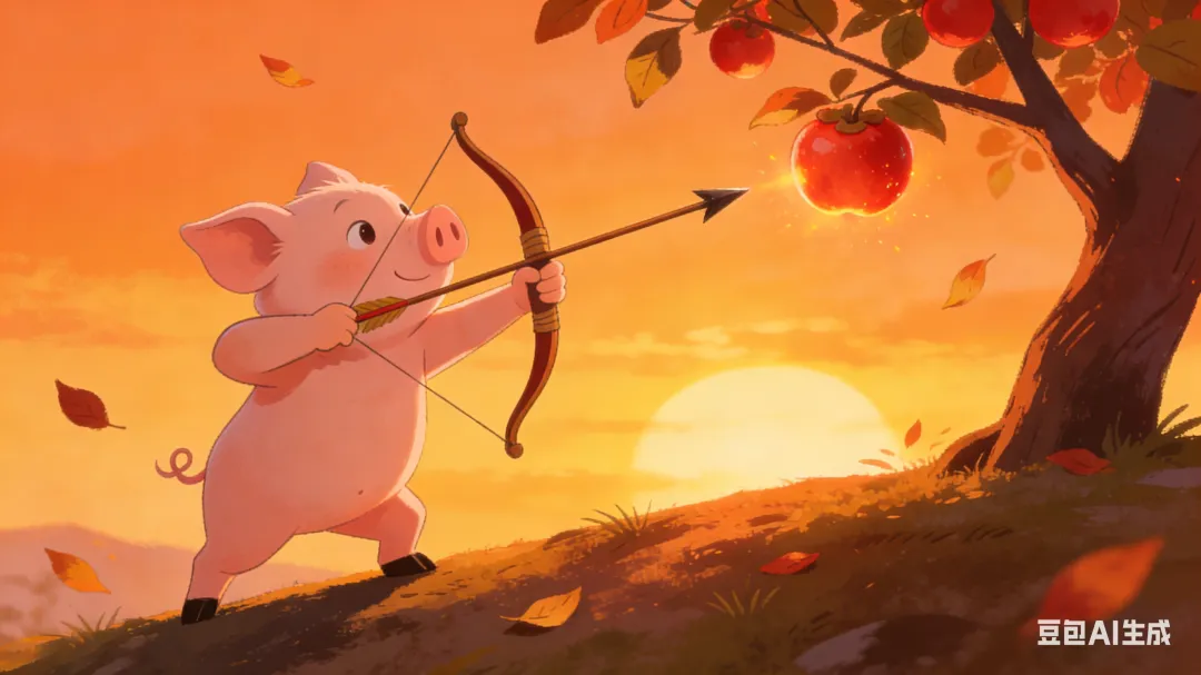 草原上住着一只小猪,它是著名的弓弩手。它不像其他小猪那样终日只知道在泥潭里打滚,每日苦练,终得一手百步穿杨的弓弩绝技。每当夕阳西下,它就会站在山坡上练习射击,箭矢总是精准地命中树上那些红透了的果子。