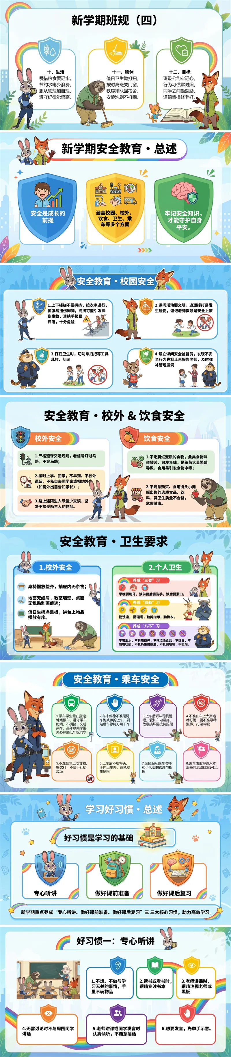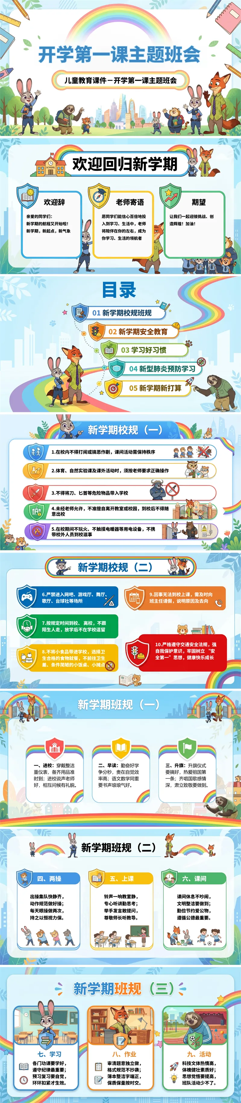 核心主题:新学期立规明纪、筑牢安全防线、养成学习好习惯、做好新学期规划,以全新面貌开启校园生活