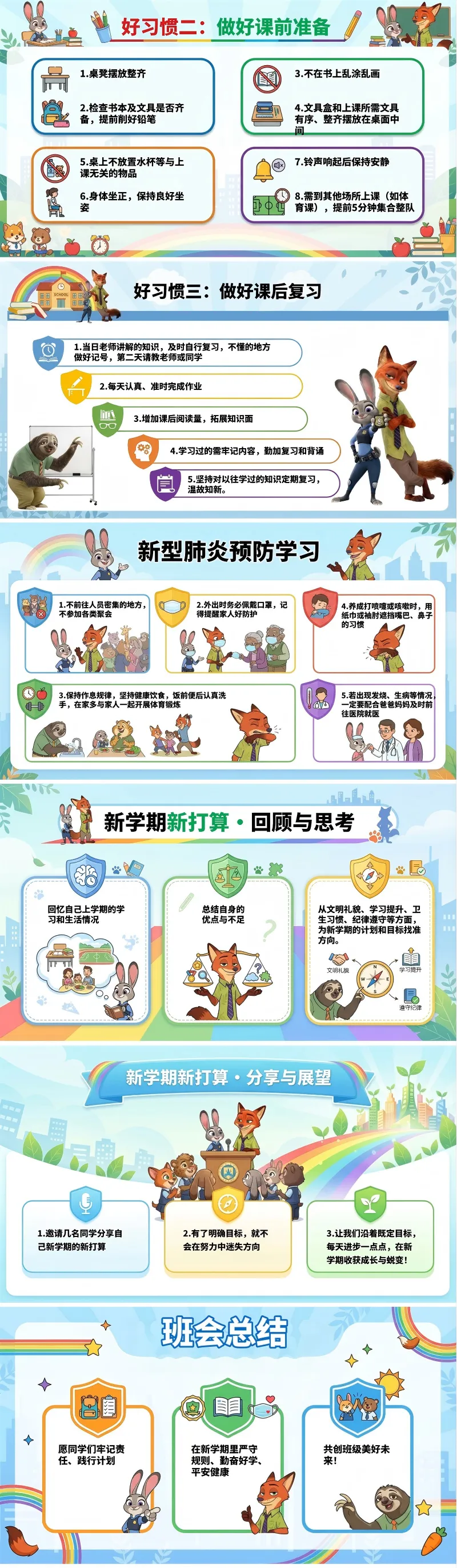 班会核心板块:校规班规、安全教育、学习好习惯、肺炎预防、新学期新打算