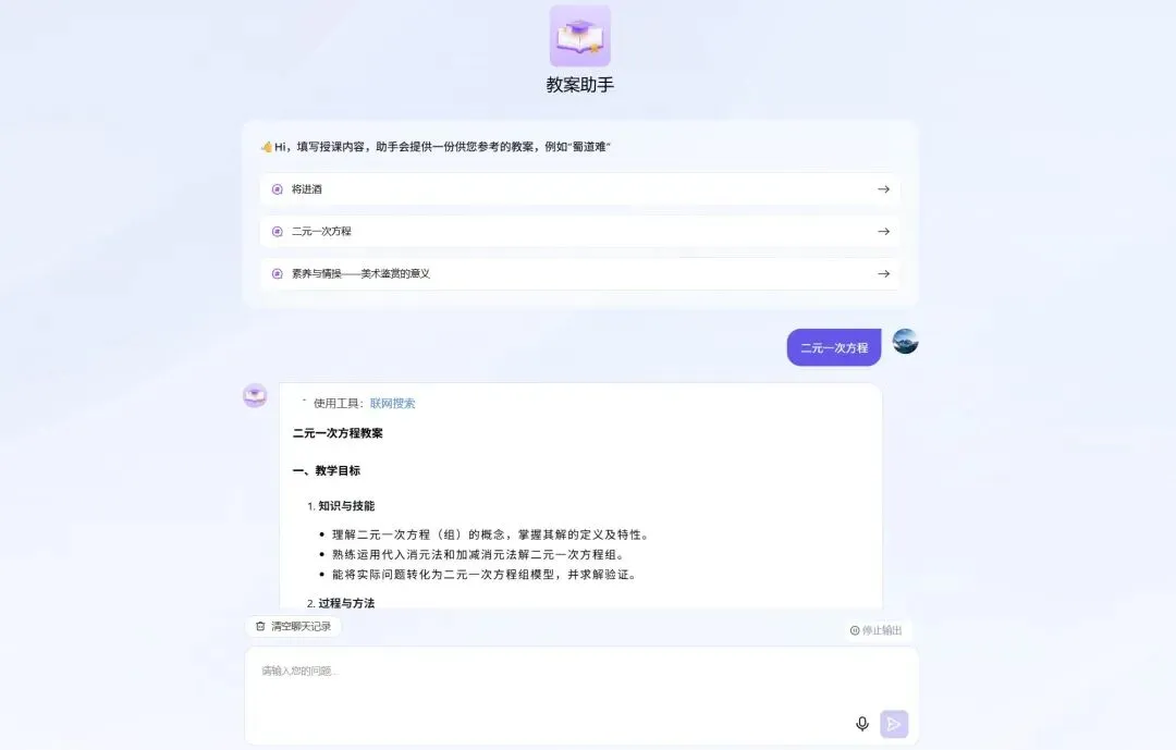 目前最火的免费AI工具之一,支持长文本处理,可以上传现有教案进行优化改写,智能调整教学环节。