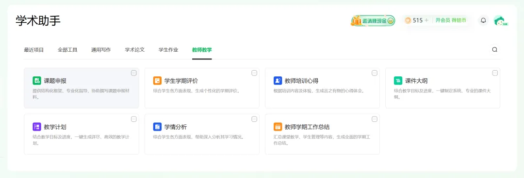 打开首页,在“学术助手”一栏选择“教师教学”,找到合适的模板,输入你想生成的主题和关键词。