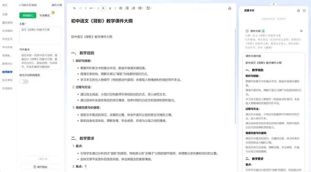 腾讯推出的智能写作助手,界面简洁易用,支持多种教案模板,从教学目标到教学过程一键生成。