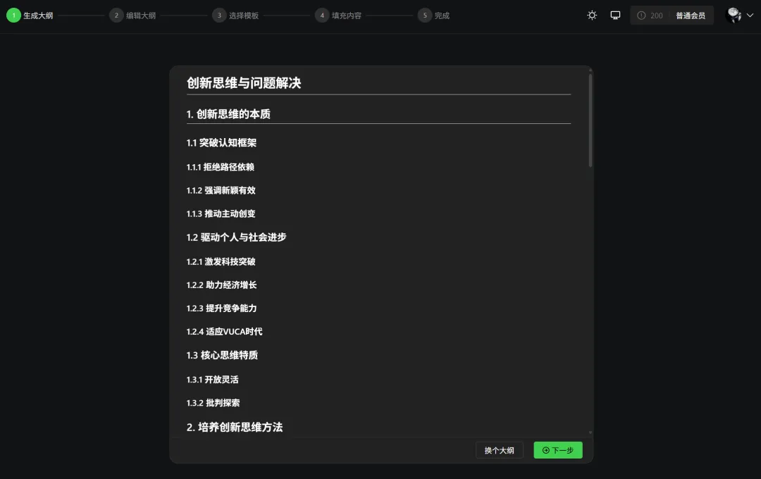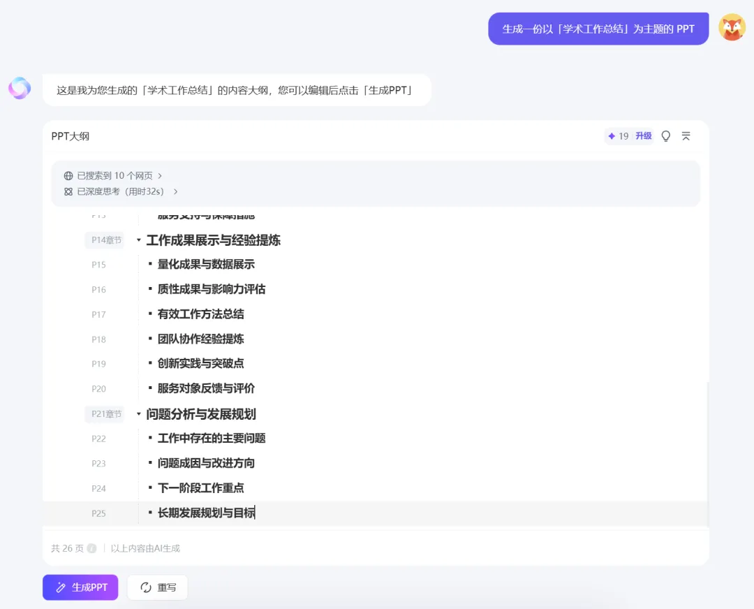 点击“生成PPT”,对于生成的内容不满意还可以重新修改,并且点击“一键换肤”可快速更换PPT模板