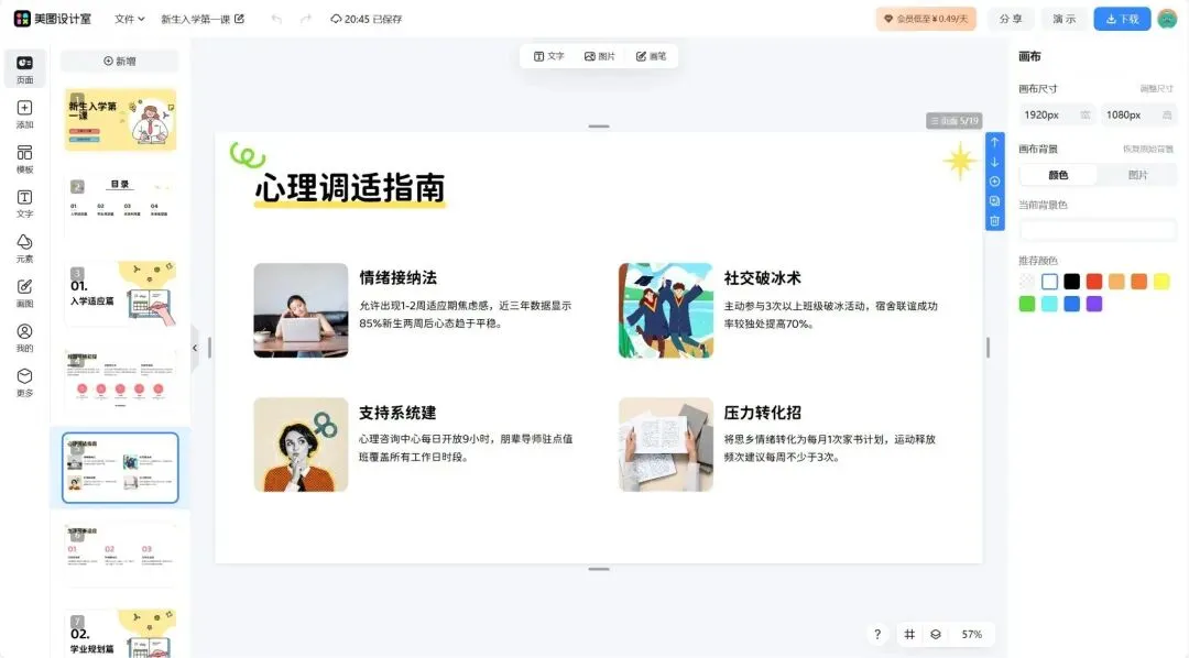 稍微完善一下大纲内容后,点击一键生成图文并茂的幻灯片,还可智能匹配动画效果。