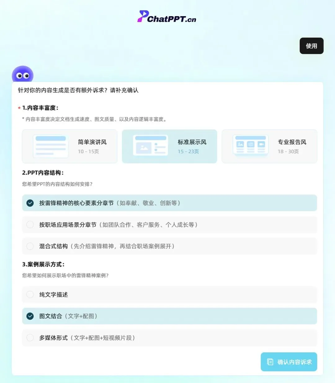 对话框输入需要生成的PPT需求,选择模板并生成大纲和内容
