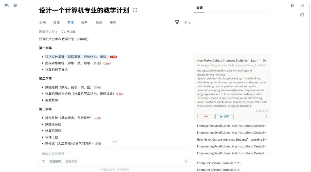 AI搜索引擎的学术模式,快速搜集教学资料,生成教学设计方案。