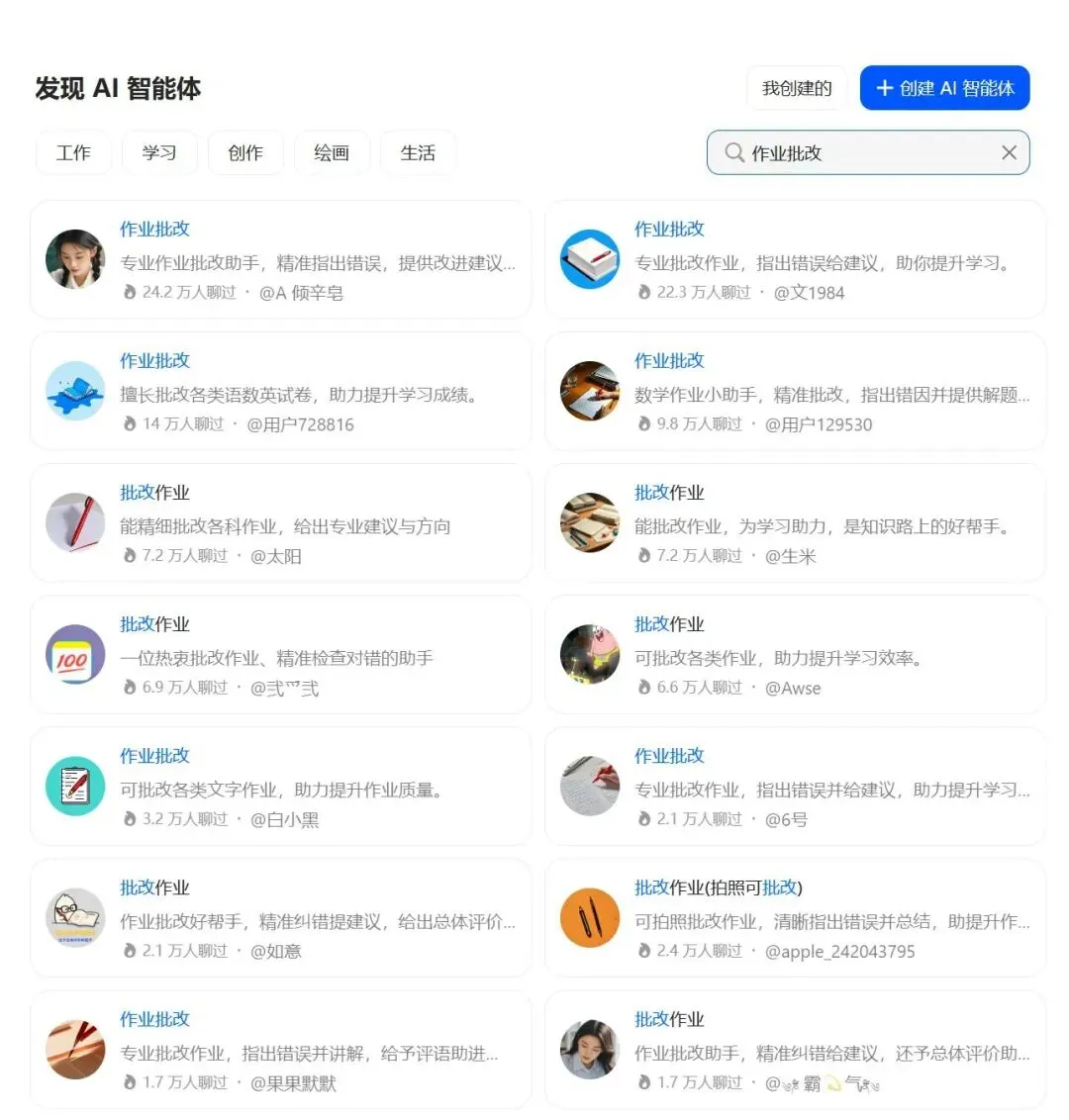 使用技巧:打开豆包智能体页面,搜索“作业批改助手”