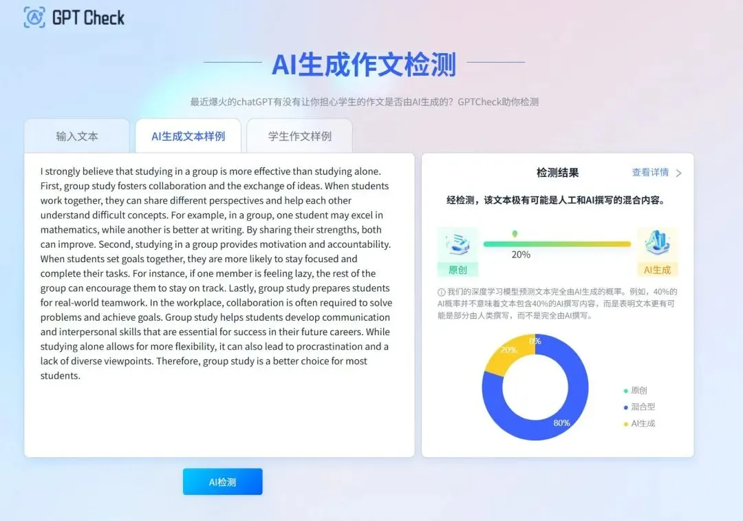 使用技巧:将英语文本粘贴到GPT Check输入框,点击“AI检测”