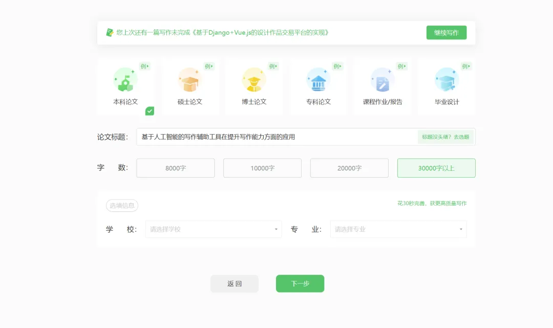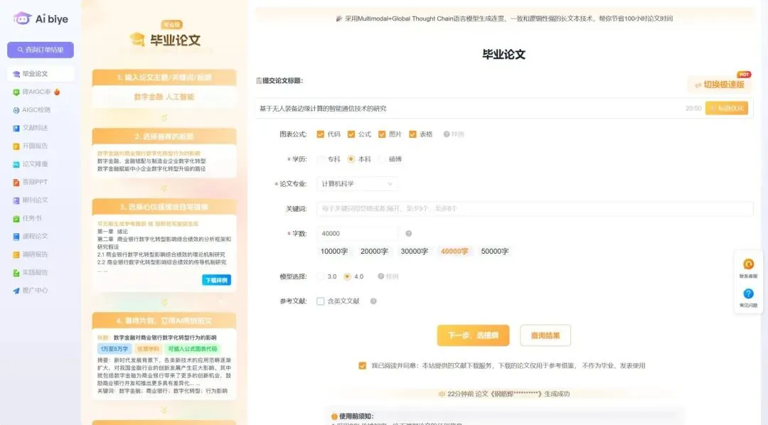 1. 输入需求:智能生成标题、选择学科、设定字数(支持本科1万字到在职硕士5万字)。