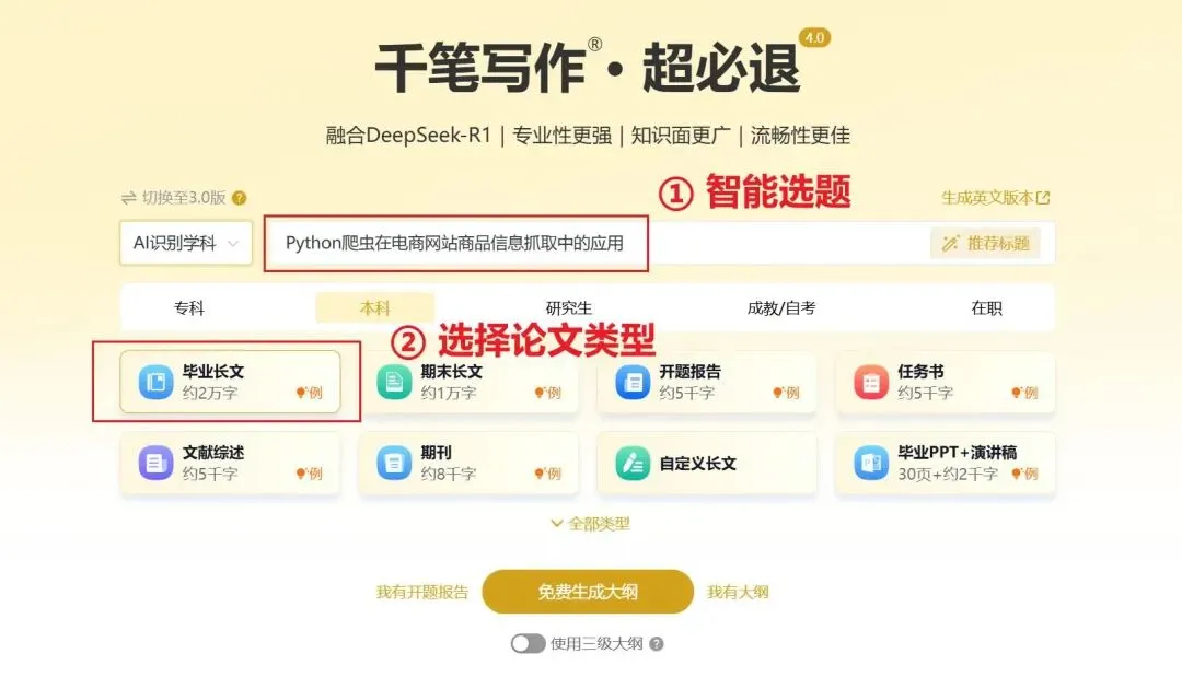 输入论文标题,选择学历、专业、字数等,并点击生成大纲