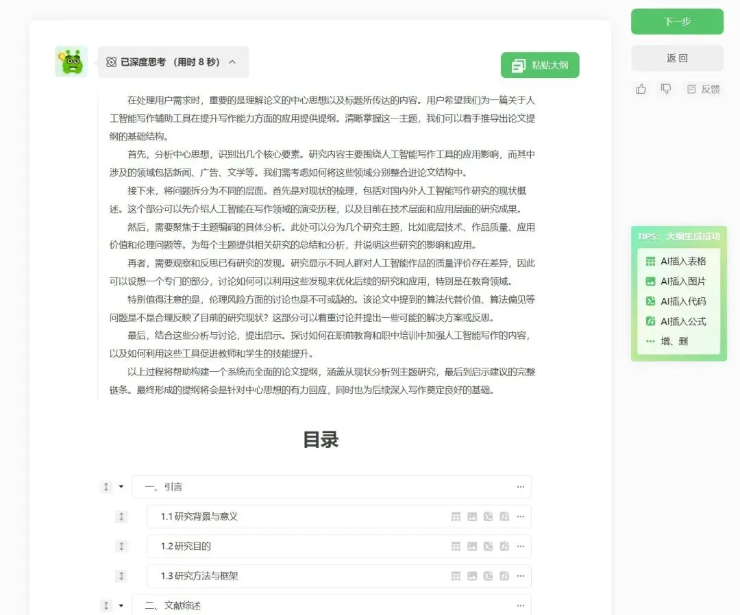 接着完善大纲,可用AI插入表格、图片、代码、公式等,最后生成完整论文