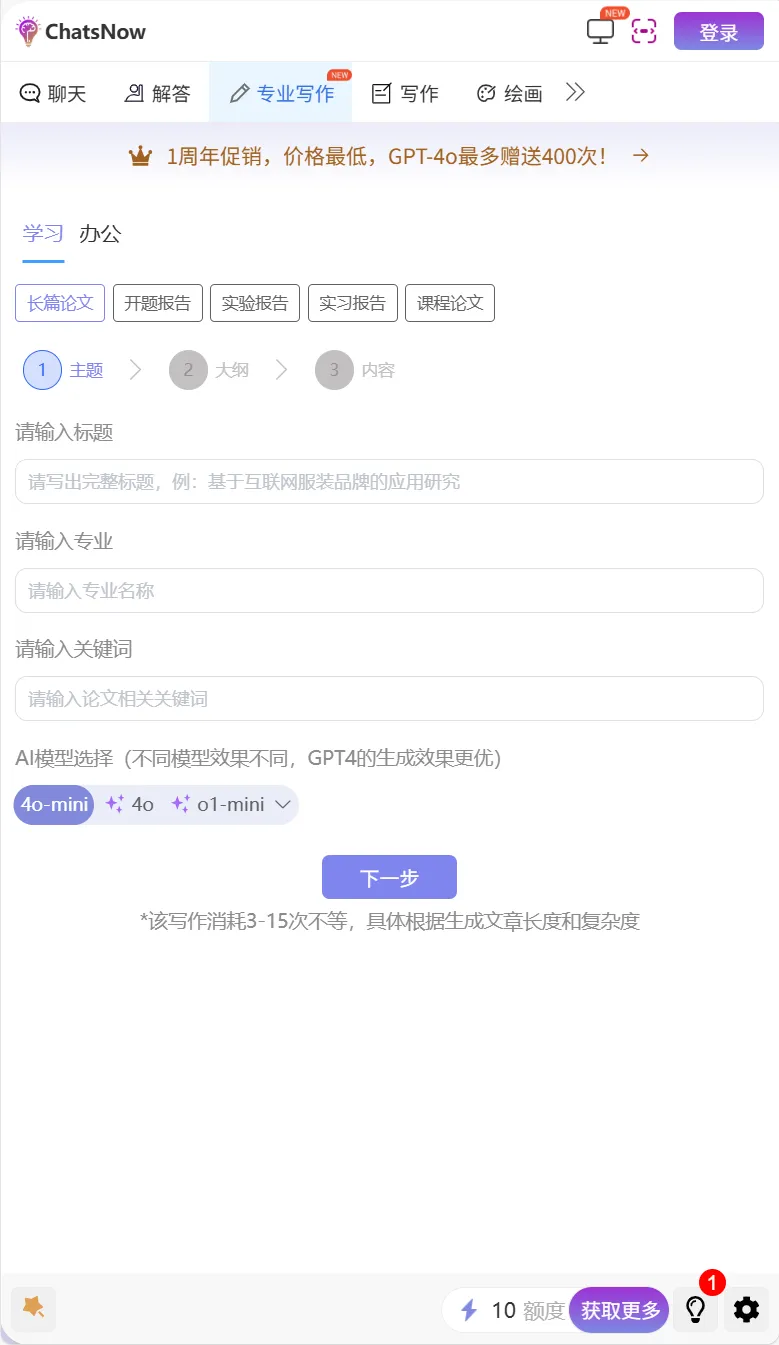 安装完成后,在浏览器扩展中打开该插件,选择“专业写作”即可创作论文