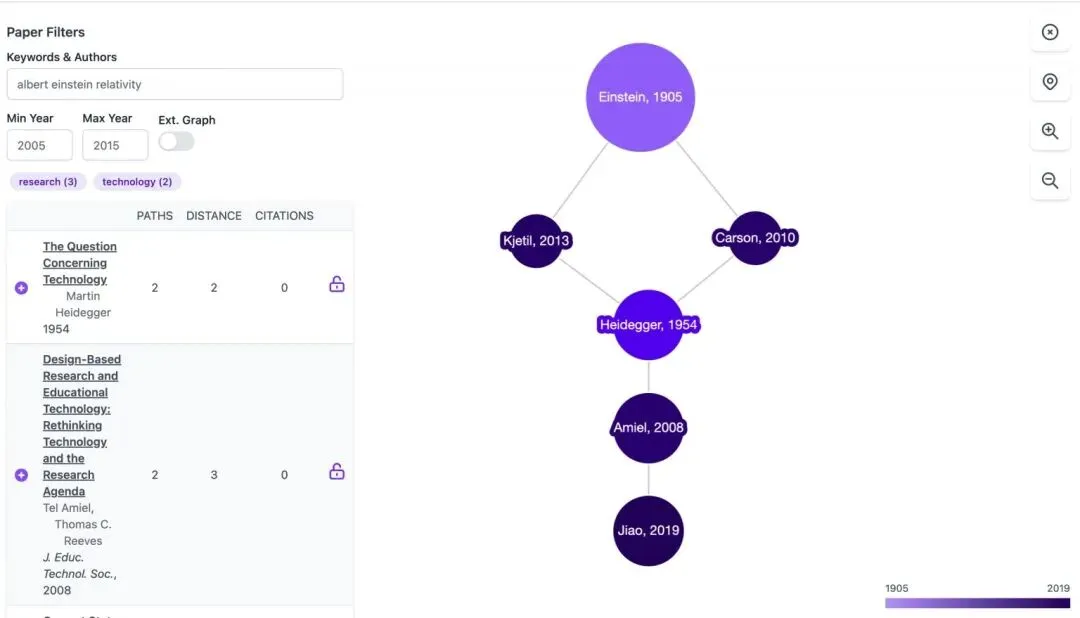 输入两篇论文文献,它将提供交互式可视化,展示二者如何通过文献连接起来