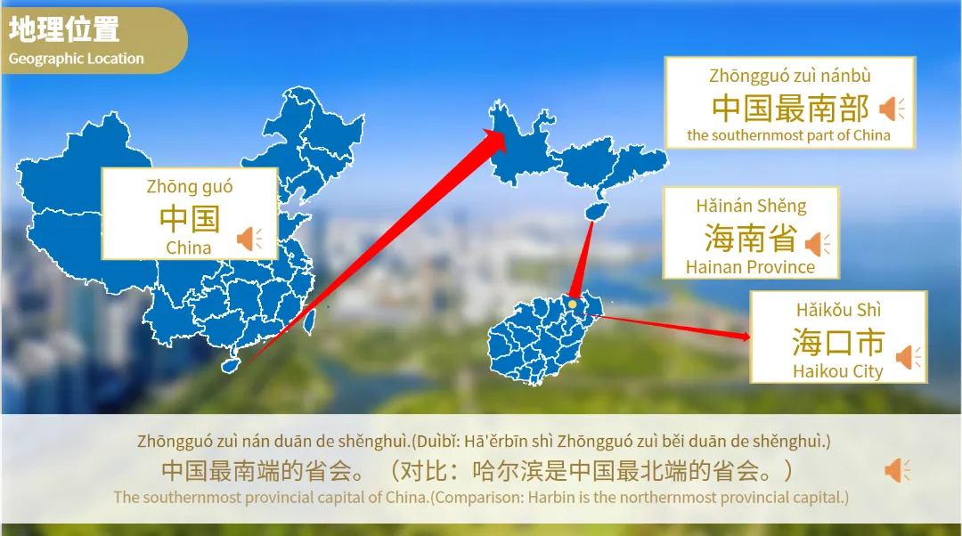 “畅游中国—海口”课件首先从地理位置入手,为学生们构建起对海口的基本认知。通过清晰的地图展示和简洁的讲解,学生们可以了解到海口位于中国最南部省份海南省,是该省的省会。与哈尔滨作为中国最北端省会的对比,更强化了海口在地理位置上的独特性,让学生们对这座位于南海之滨的城市有了初步的印象。