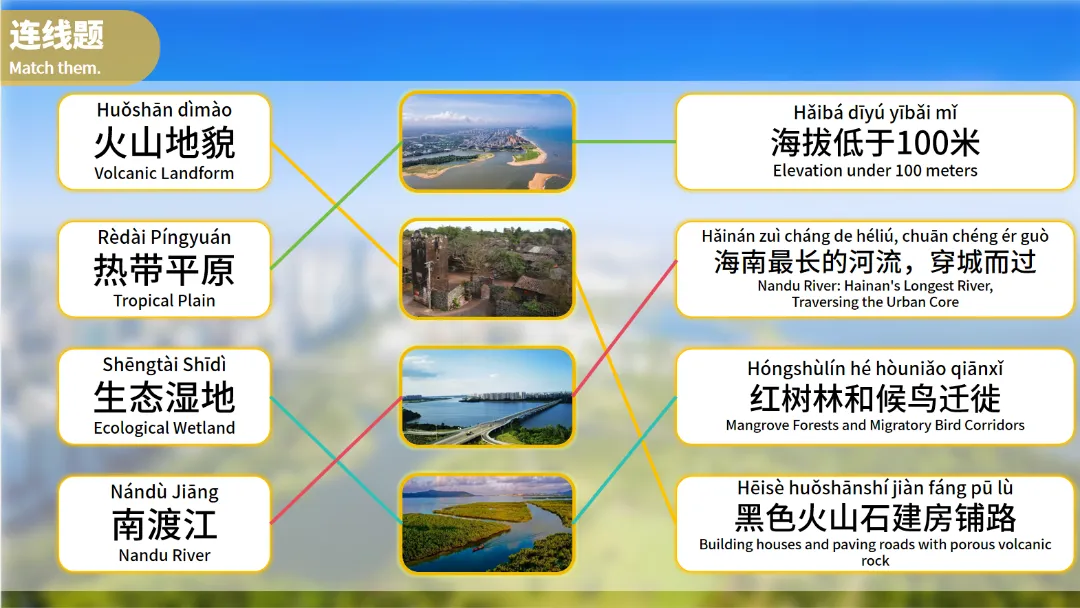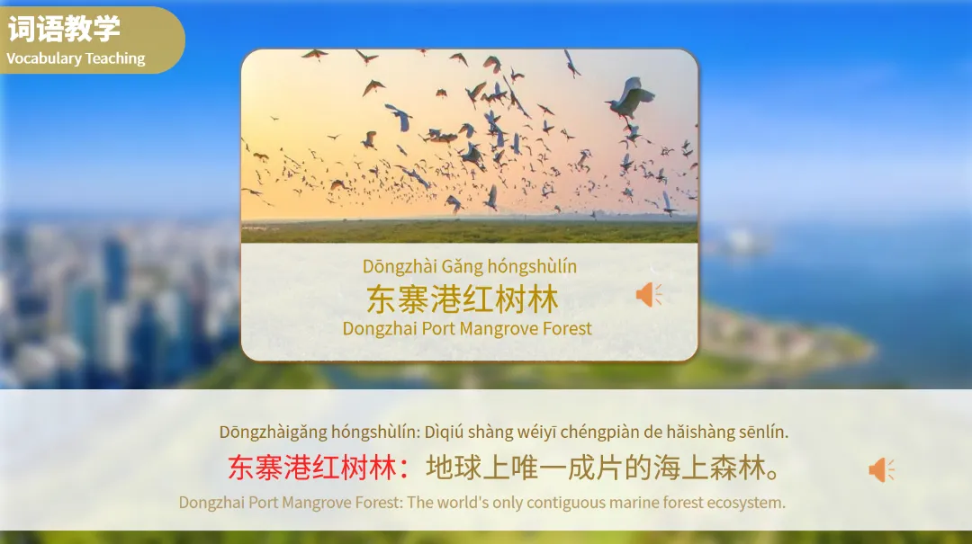“东寨港红树林”这一地球上唯一成片的海上森林,不仅展示了海口独特的自然景观,还让学生们学习了相应的中文表达;