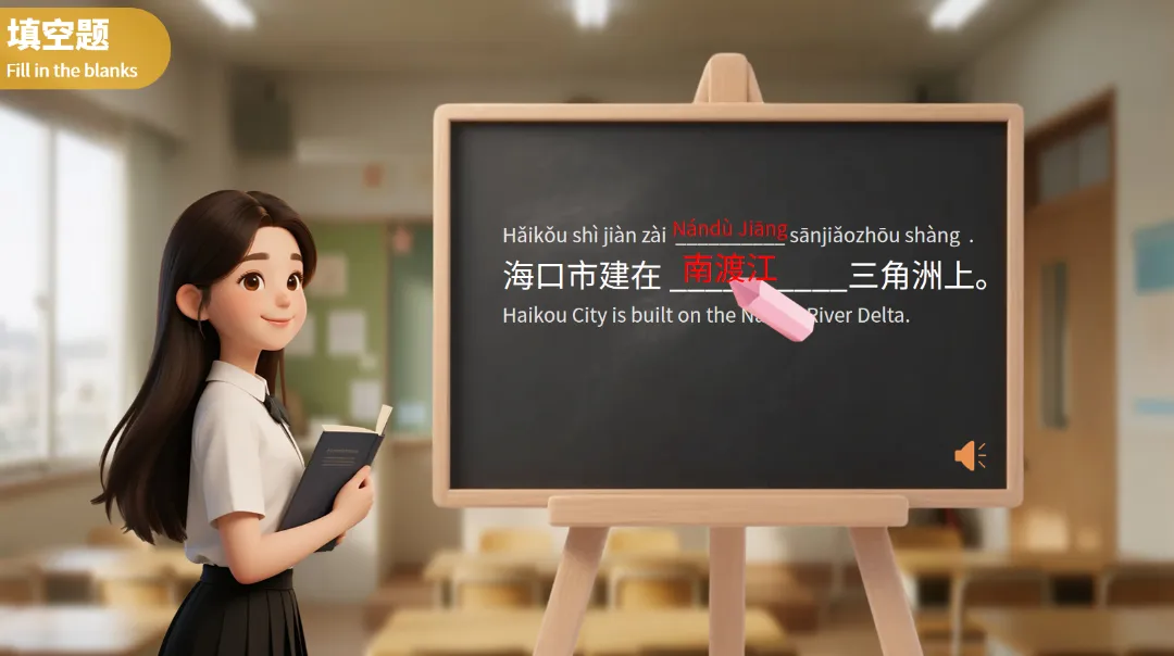 填空题通过呈现“海口市建在____三角洲上”等语句,强化学生对地理知识的记忆。
