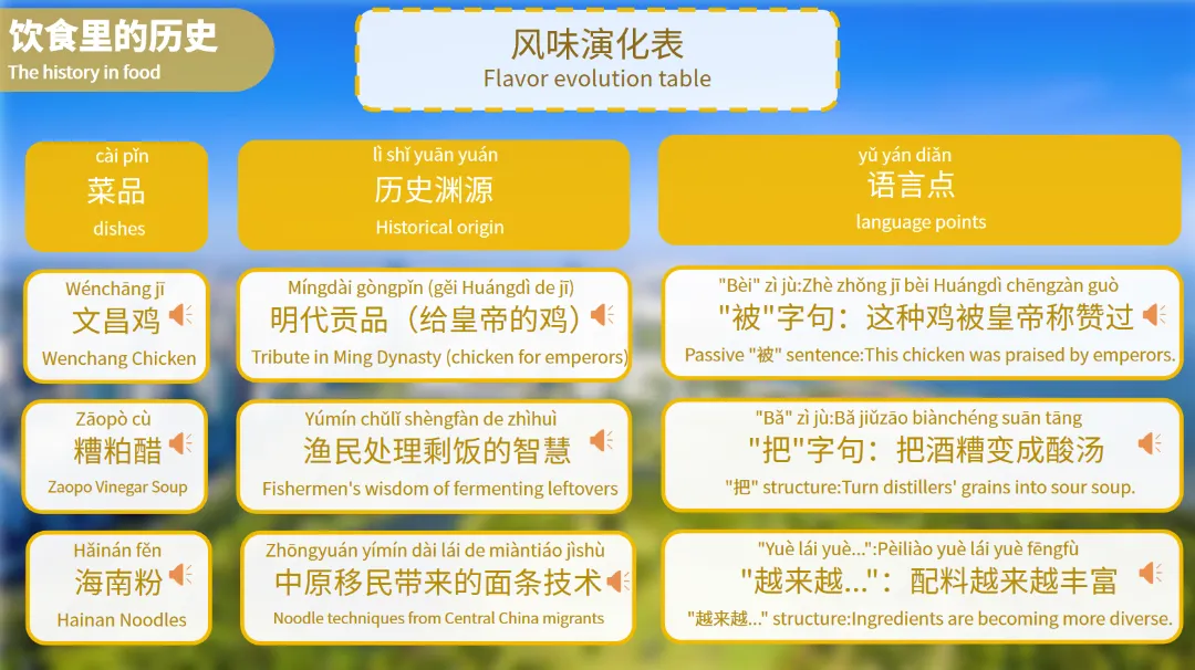 除了地理和建筑文化,课件还深入挖掘了海口的饮食文化。“饮食里的历史”板块通过“文昌鸡”“糟粕醋”“海南粉”等特色菜品,讲述了它们的历史渊源、制作智慧以及背后的文化交融。