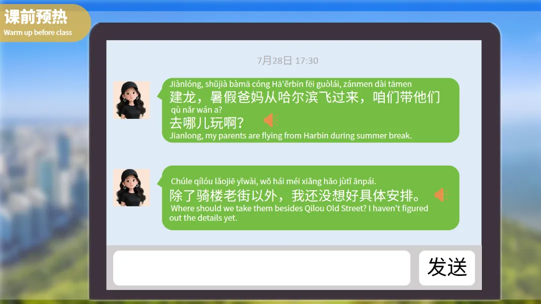 课件中的课前预热环节,通过模拟学生之间的对话交流,营造出真实的语言学习场景。