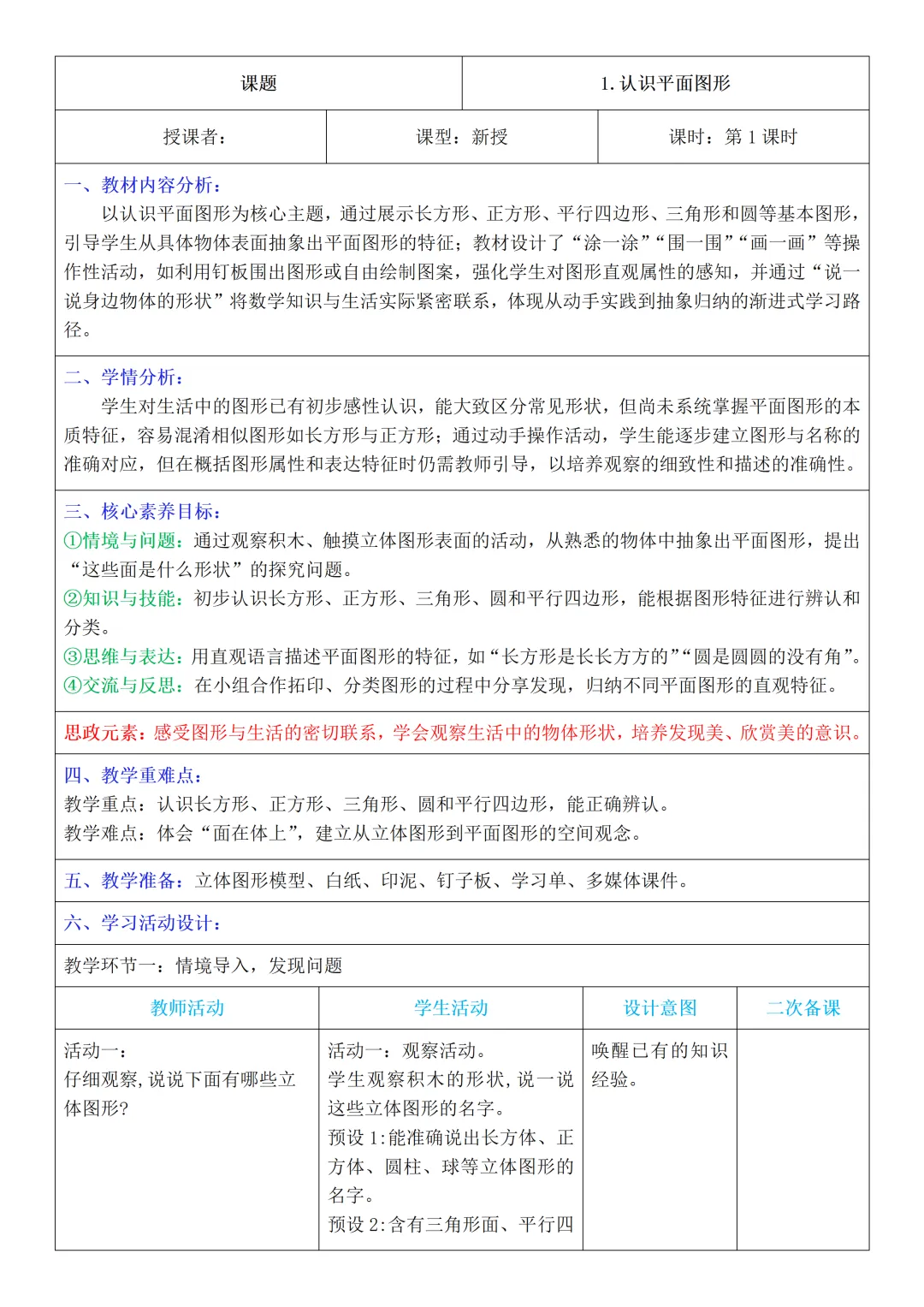 新教材 人教版数学一年级下册核心素养教案含反思++思政元素共4套